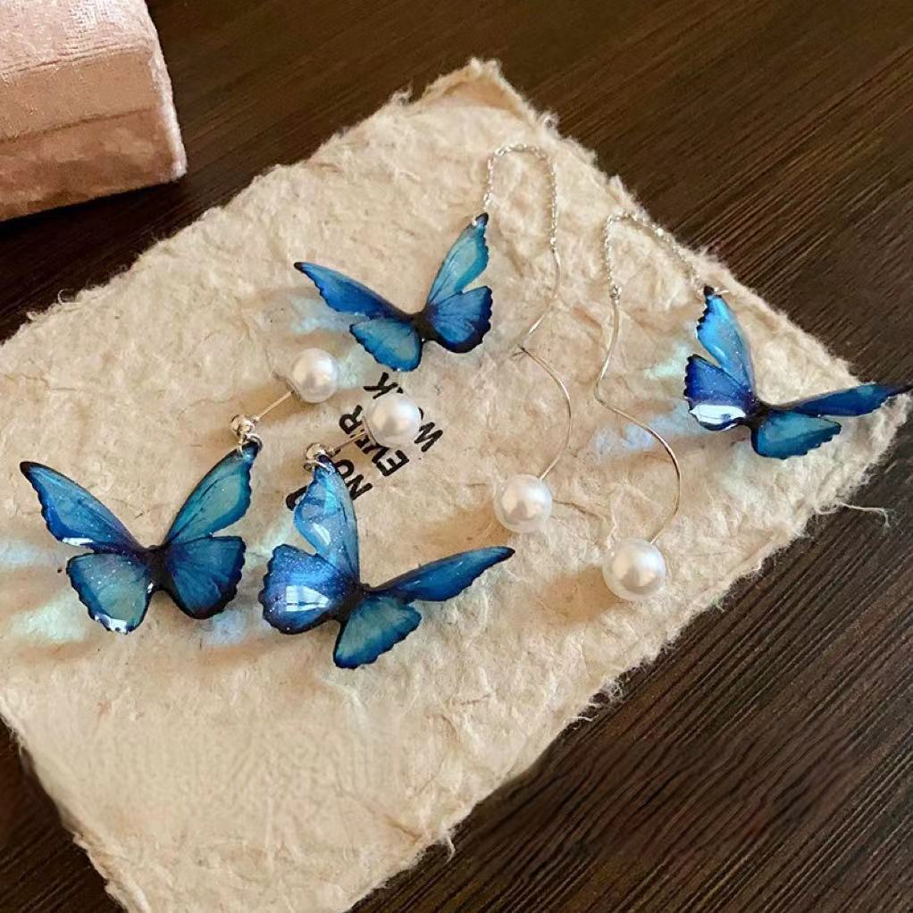 银针蝴蝶珍珠耳环小众气质氛围感耳坠文艺小清新百搭简约耳饰女