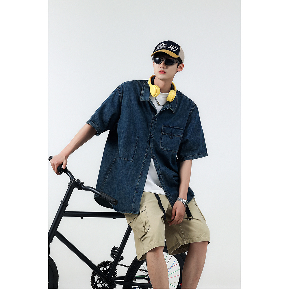 夏季新款纯色错位口袋短袖牛仔衬衫宽松日系复古潮流休闲半袖衬衣