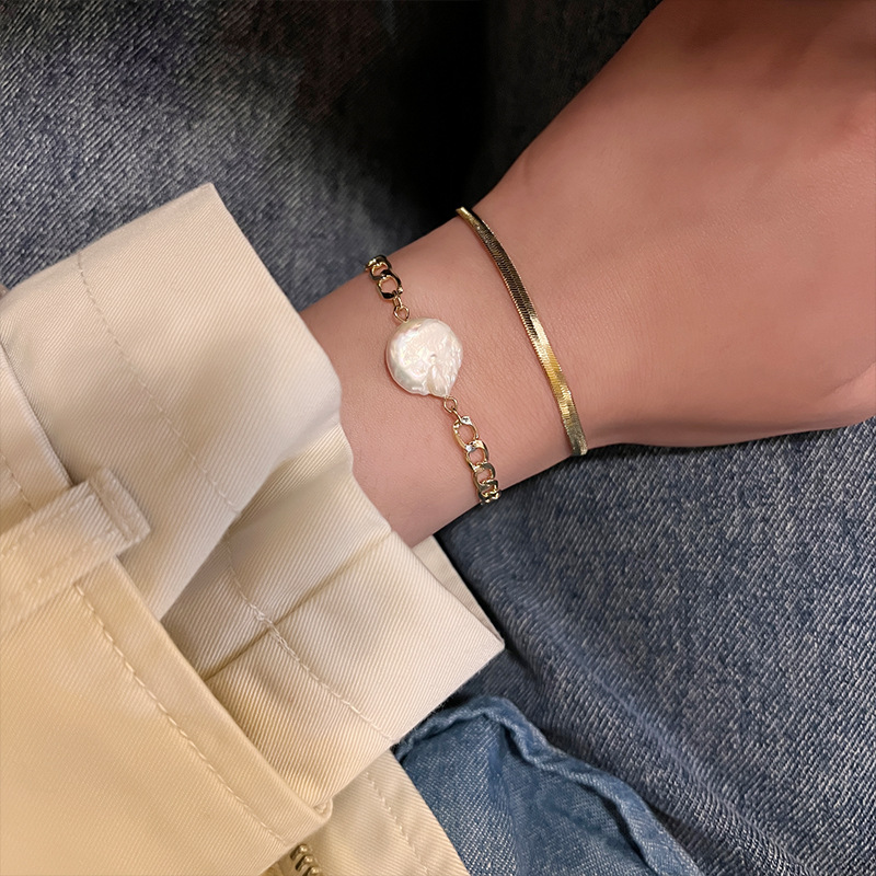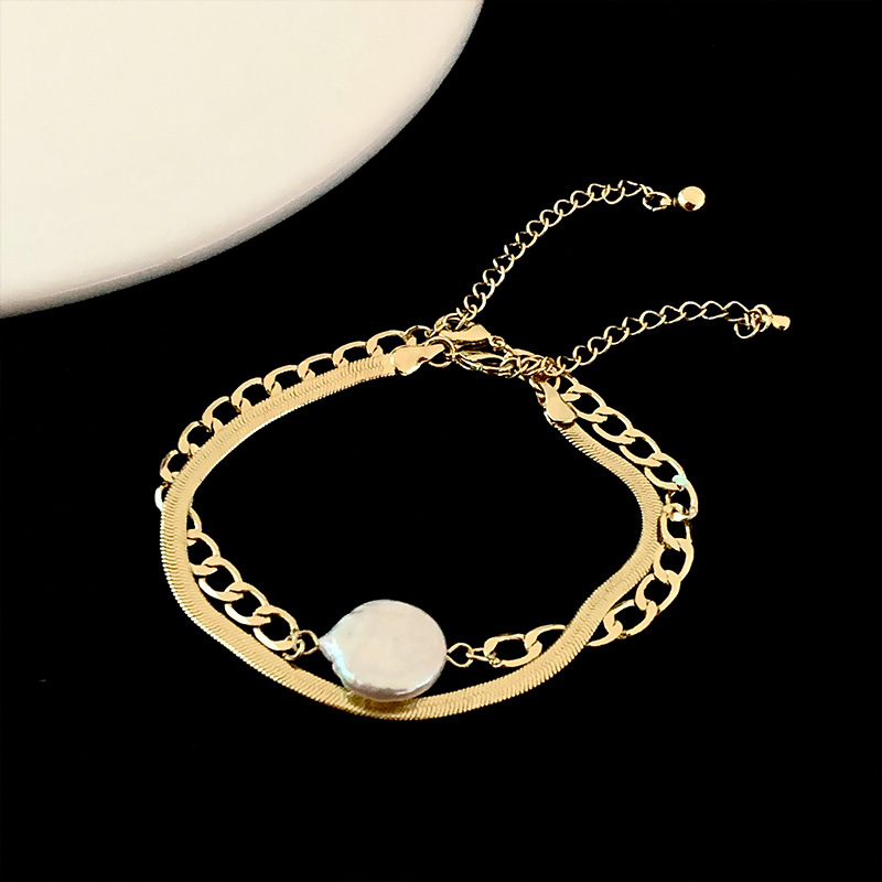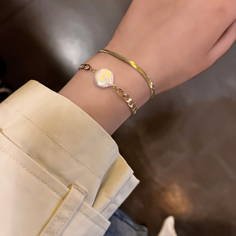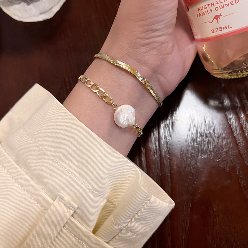 个性轻奢双层叠戴天然异形珍珠手链 ins气质小众设计嘻哈链条手饰