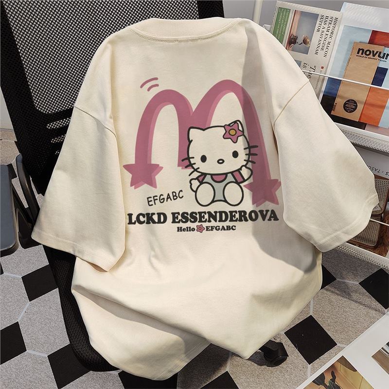 重磅纯棉美式卡通HelloKitty印花杏色短袖t恤女夏季ins风宽松上衣