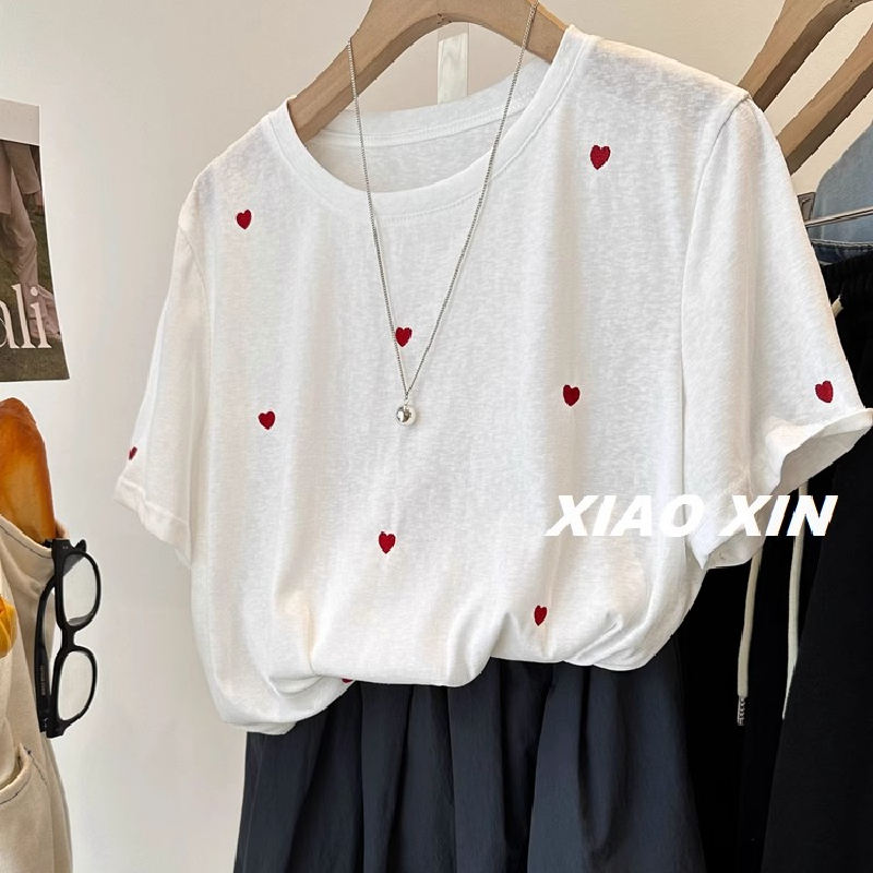 新款韩系甜美刺绣红爱心精梳棉短袖t恤女夏季宽松百搭上衣打底衫