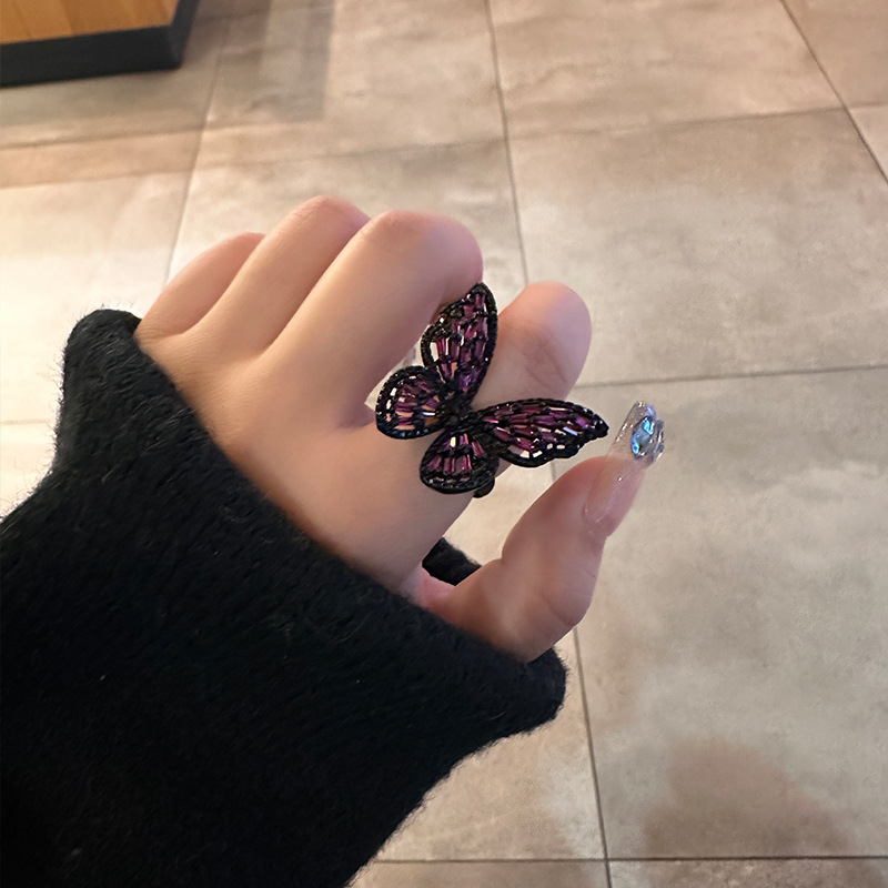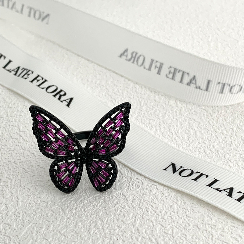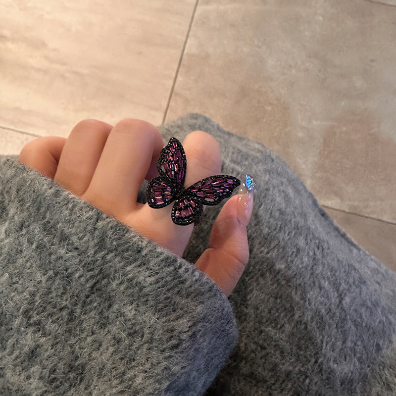 轻奢高级感黑粉闪钻蝴蝶戒指女小众设计立体镂空食指戒开口指环潮