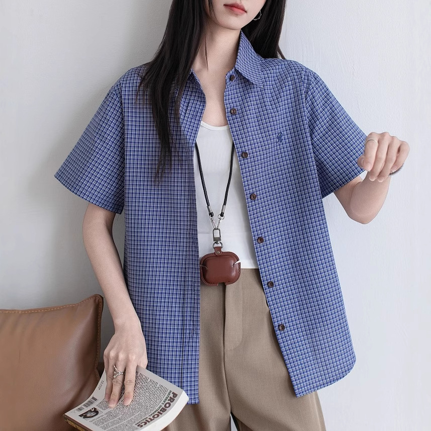 气质推荐~夏季女棉色织韩系复古百搭MIU系蓝色格纹短袖衬衫