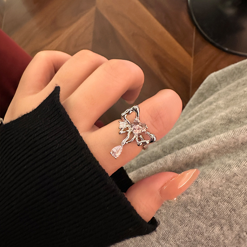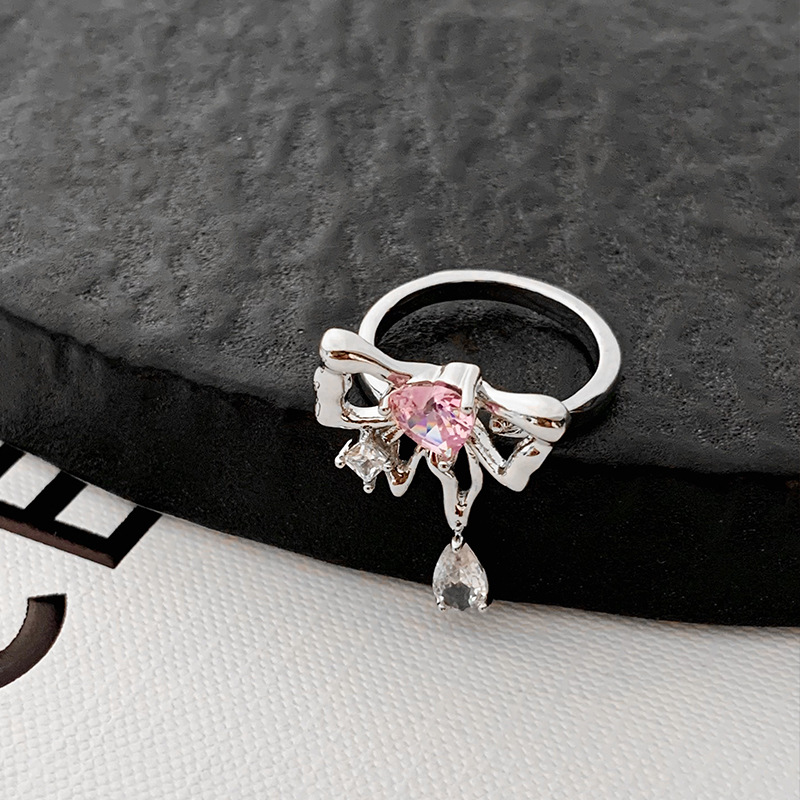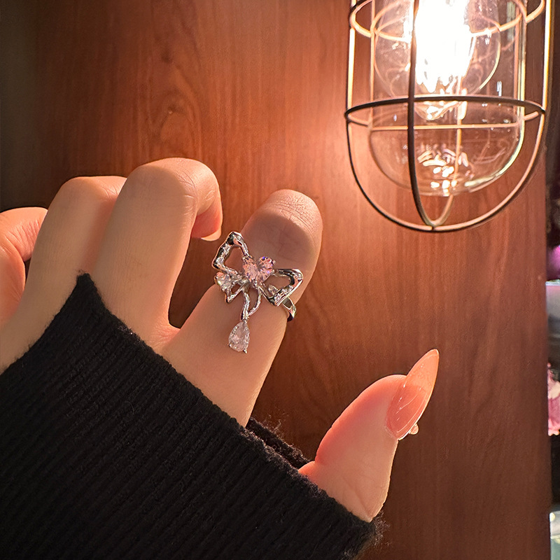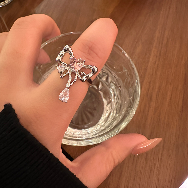 甜美粉色爱心锆石蝴蝶结戒指女气质高级感简约开口食指戒百搭配饰