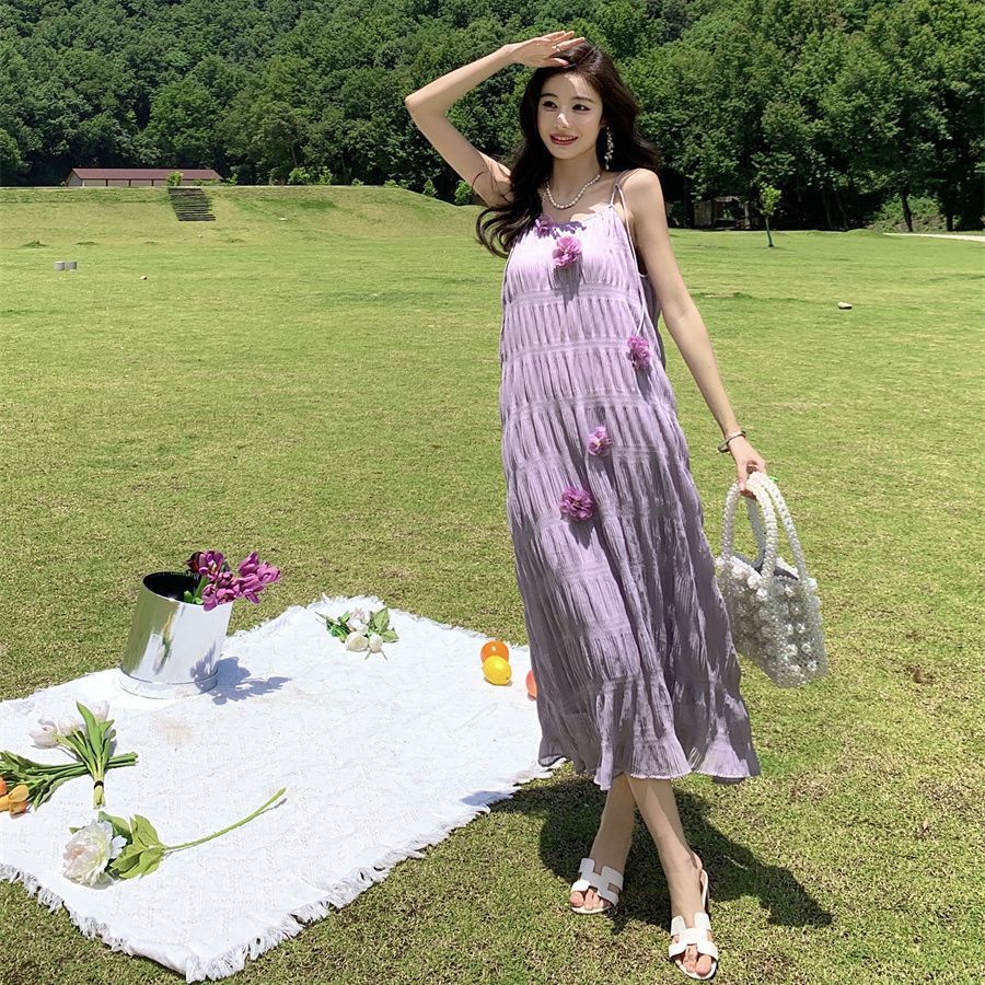 仙女紫蔷薇小众吊带休闲度假立体花朵高级浪漫度假连衣裙夏