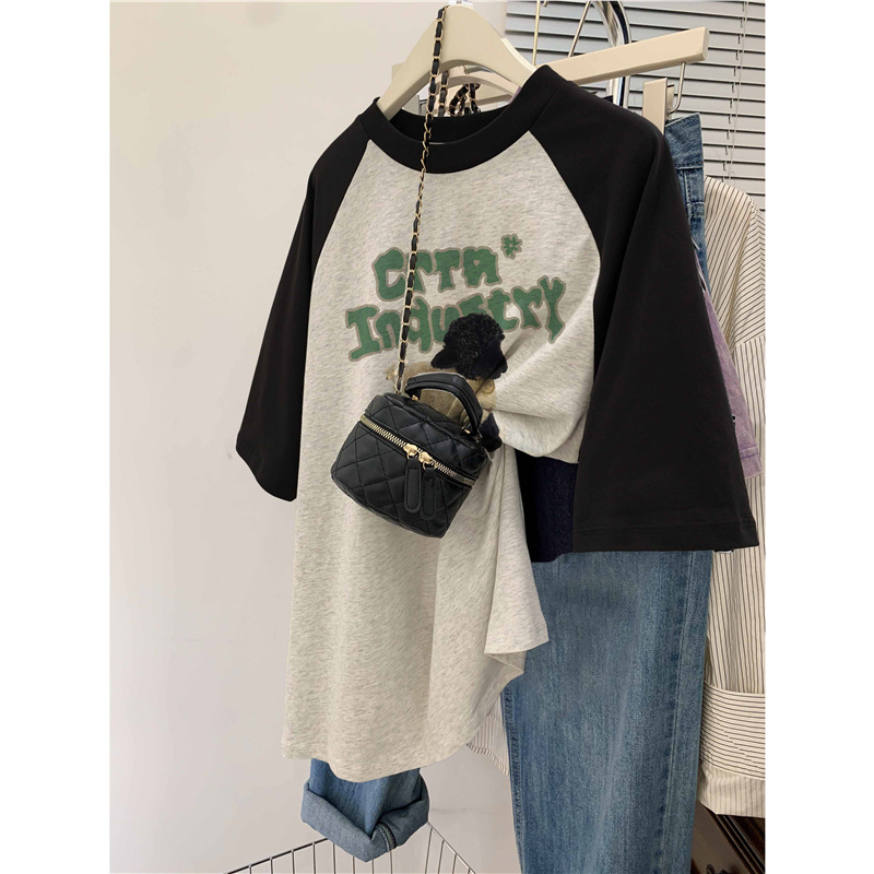 夏季新款撞色短袖t恤女美式设计感插肩袖修身正肩短款上衣ins甜美