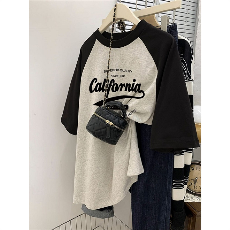 夏日多巴胺穿搭上衣女新款韩版插肩袖正肩T恤ins潮牌大码短袖