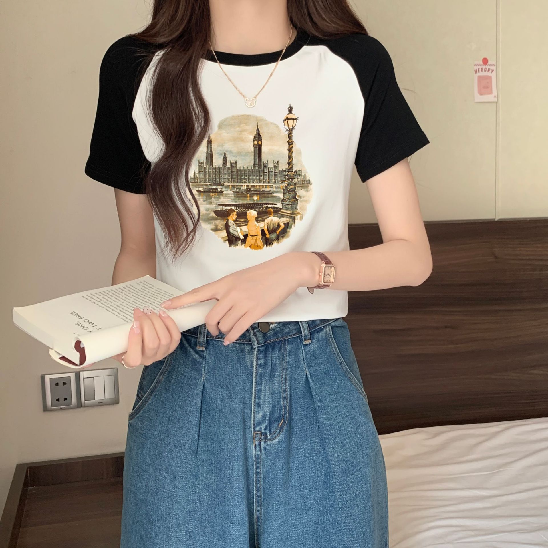 复古插肩袖t恤女短袖夏季设计感小个子修身短款休闲上衣