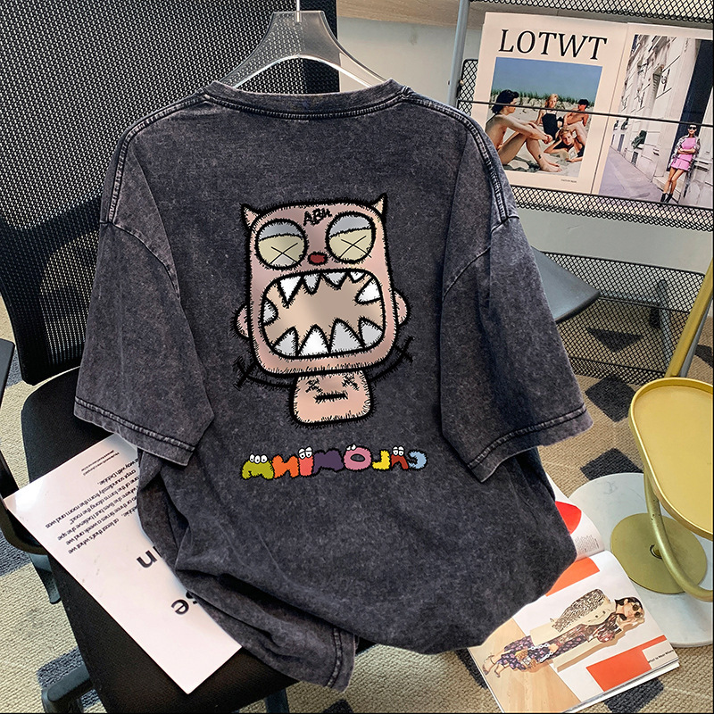 美式复古水洗黑色纯棉短袖潮牌t恤女夏季胖妹mm新款小众宽松上衣