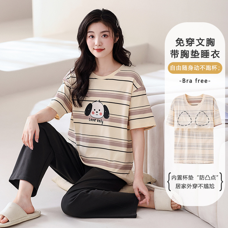 带胸垫一体睡衣女士夏季纯棉短袖卡通可外穿家居服夏天新款