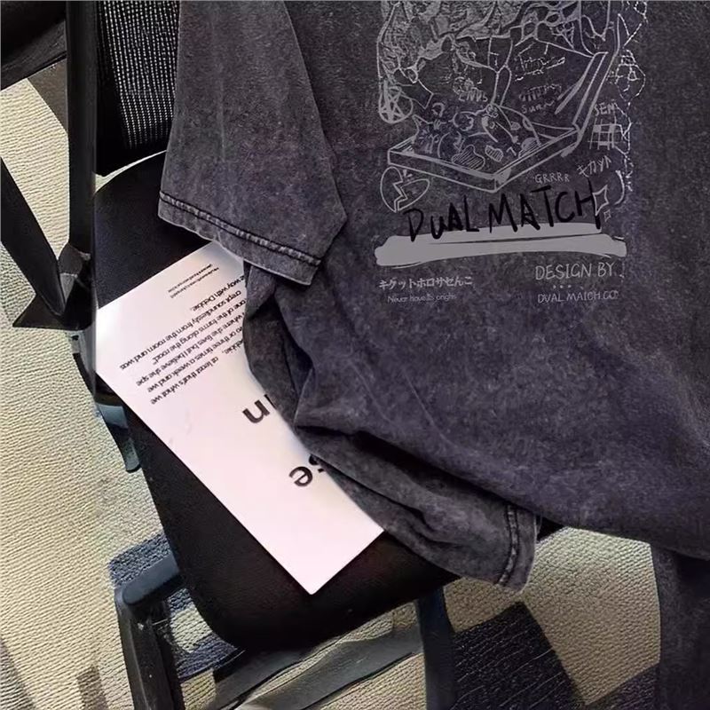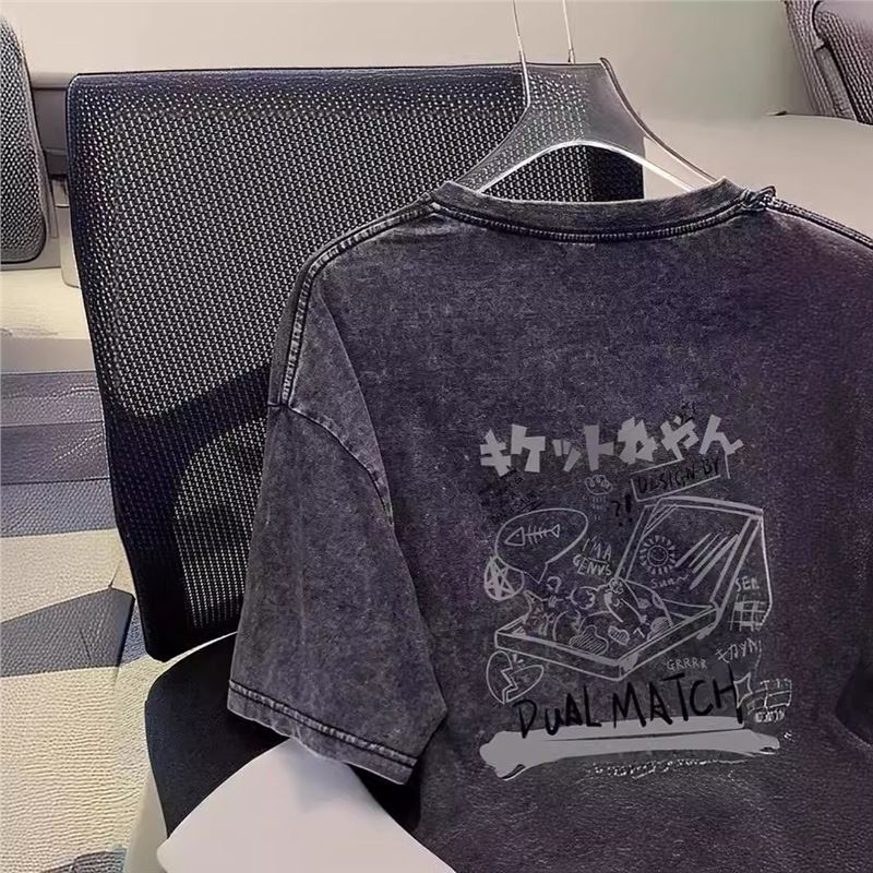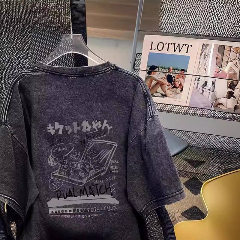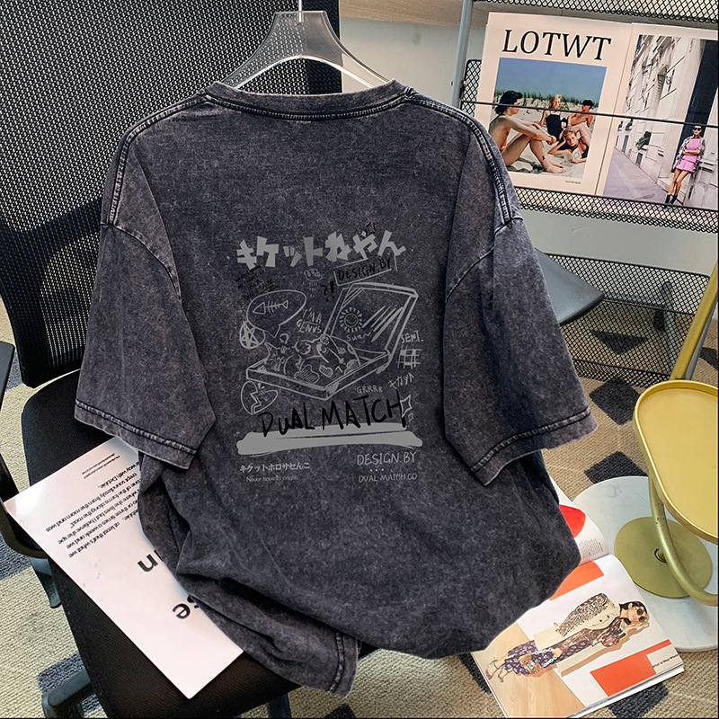 美式复古做旧水洗短袖T恤男女夏胖mm潮牌街头嘻哈印花情侣体恤衫