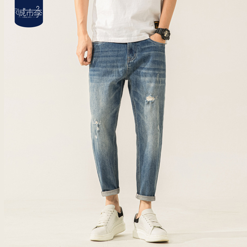 城市李#大码男装夏季阿美咔叽风九分牛仔裤男弹力破洞修身小脚裤