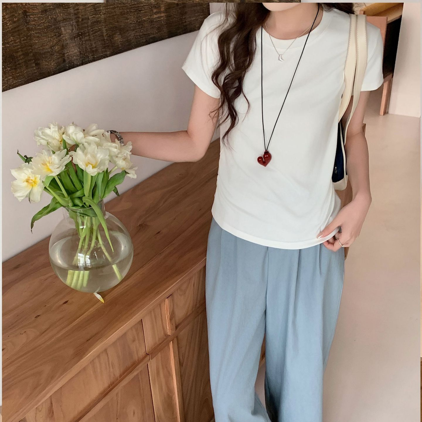 收腰褶皱正肩短袖t恤女法式圆领夏季弹力修身辣妹风显瘦短上衣女