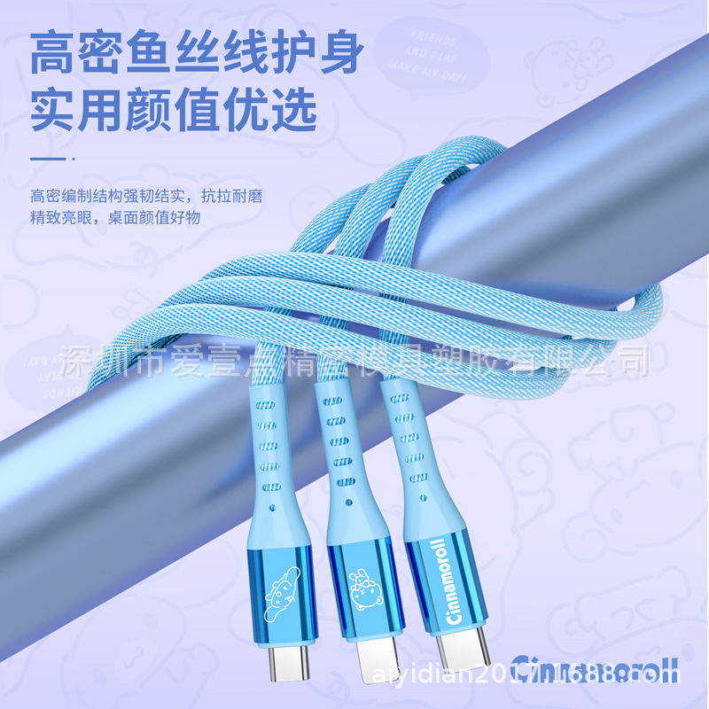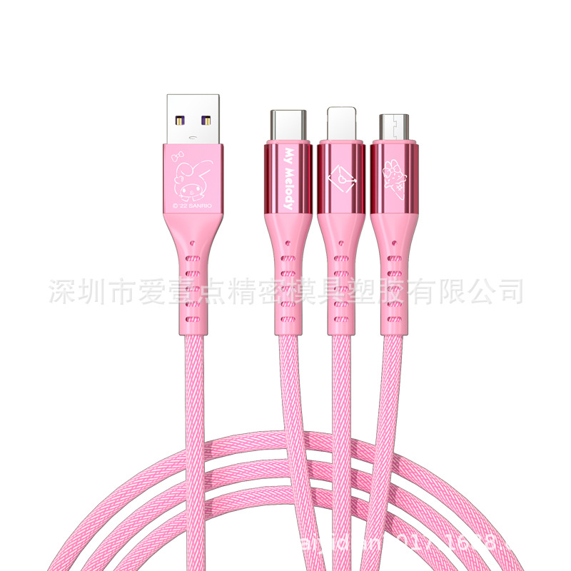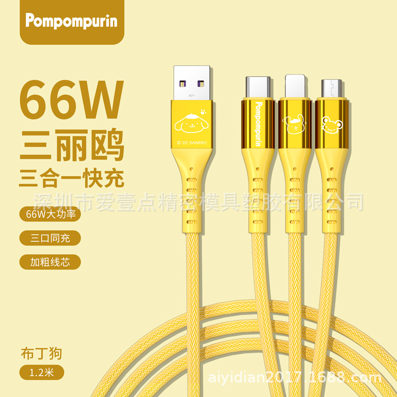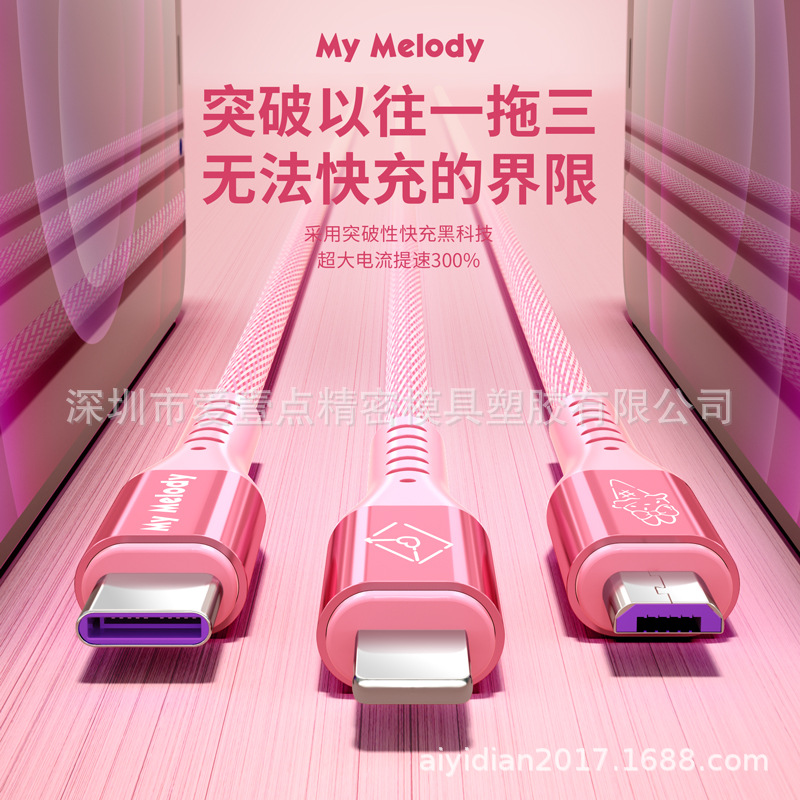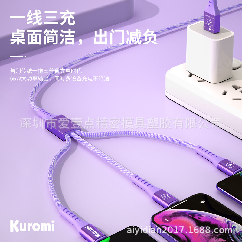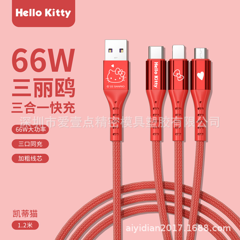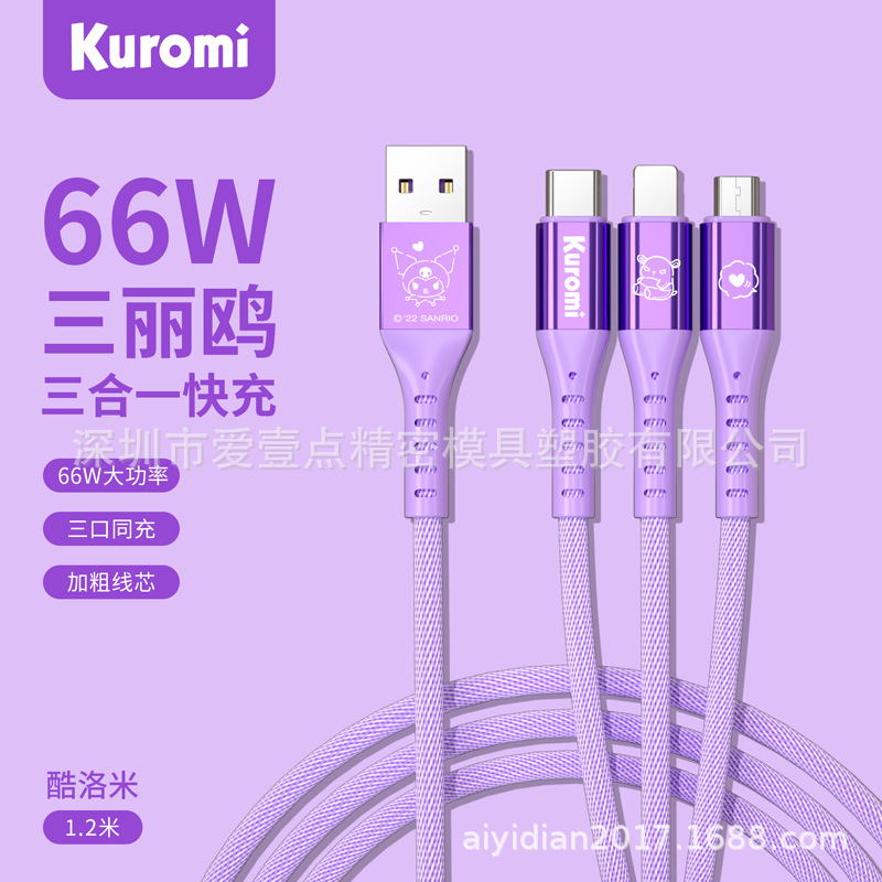 三丽鸥66W超级快充数据线一拖三强韧适用华为苹果充电线卡通