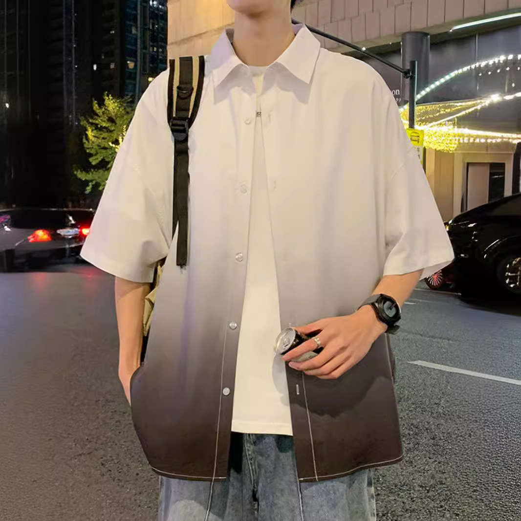 古巴领褶皱免烫黑色短袖衬衫男小众设计提花刺绣宽松休闲开衫外套