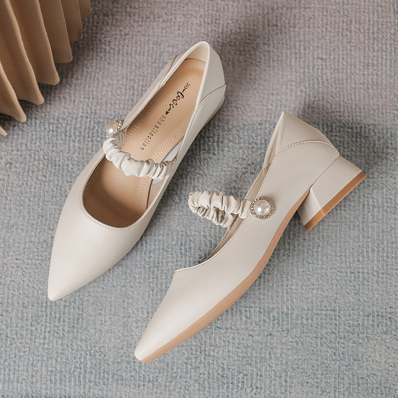 春夏新款豆豆鞋女尖头真皮粗跟单鞋女韩版时尚休闲女鞋仙女鞋