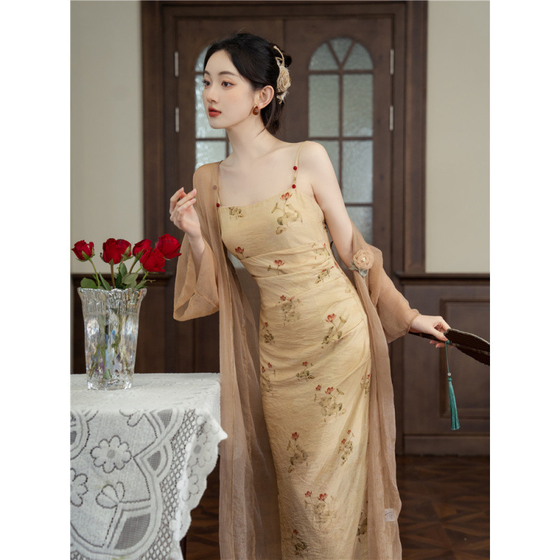 新中式轻国风印花吊带连衣裙配花朵防晒开衫复古气质两件套女