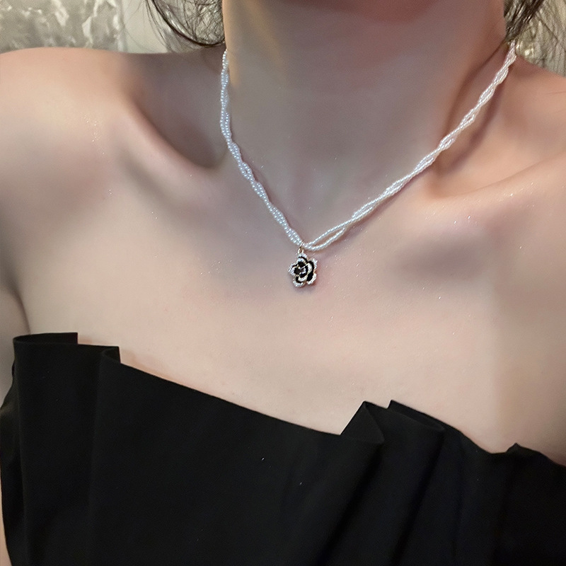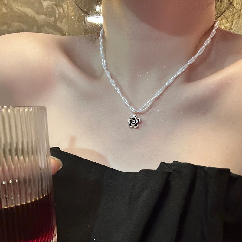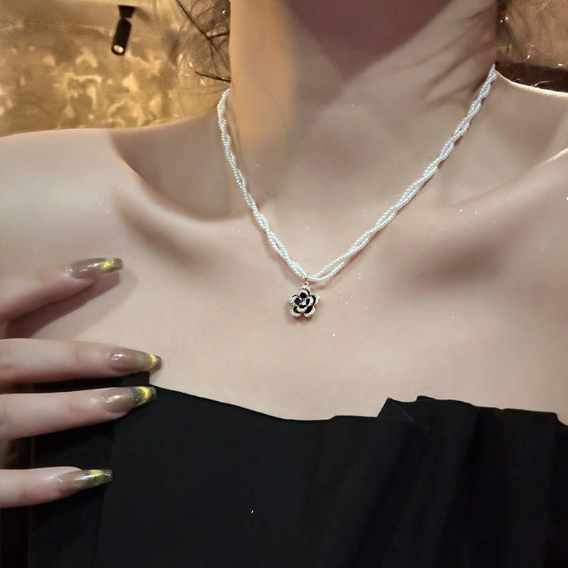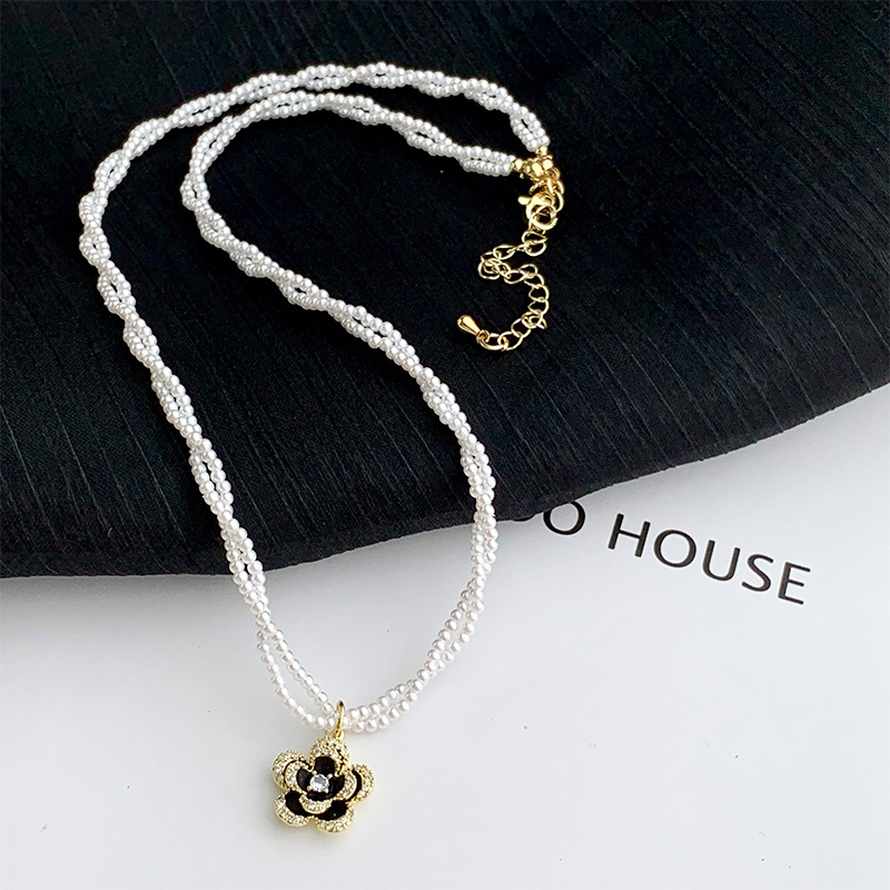 气质轻奢双层缠绕珍珠项链法式浪漫山茶花吊坠小众锁骨链颈链配饰