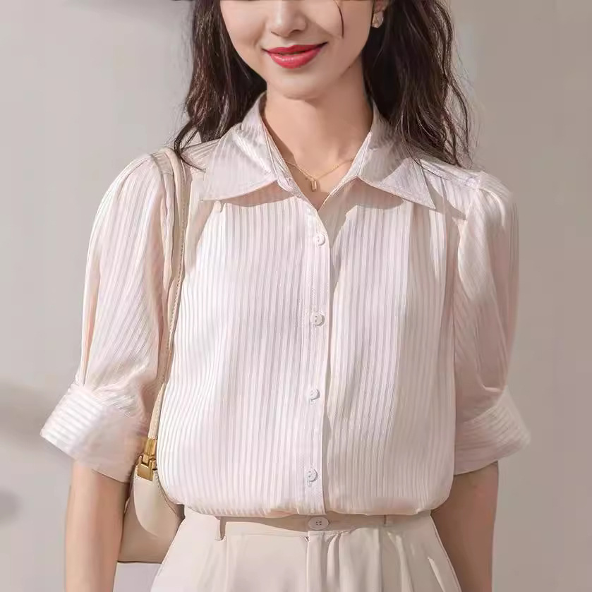 法式缎面泡泡袖杏色衬衫女短袖夏季新款通勤职业面试正装上衣