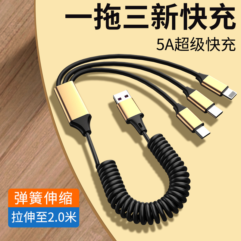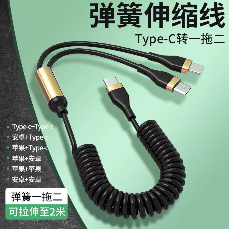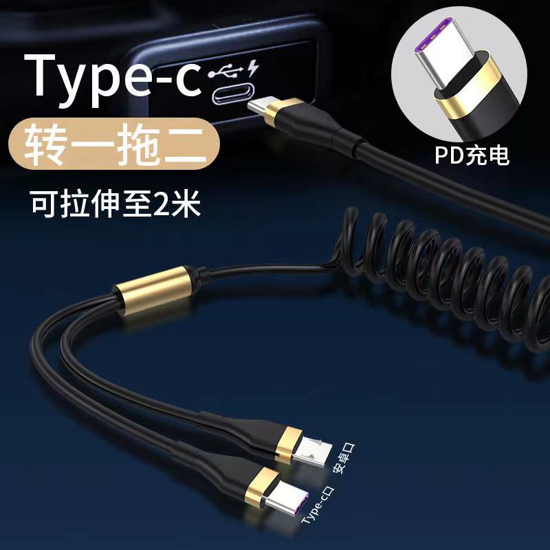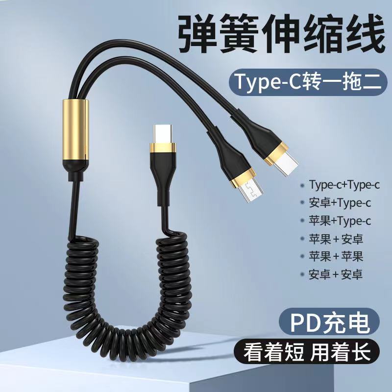 pd车载弹簧伸缩type c一拖二合一数据线适用苹果iphone13充电线