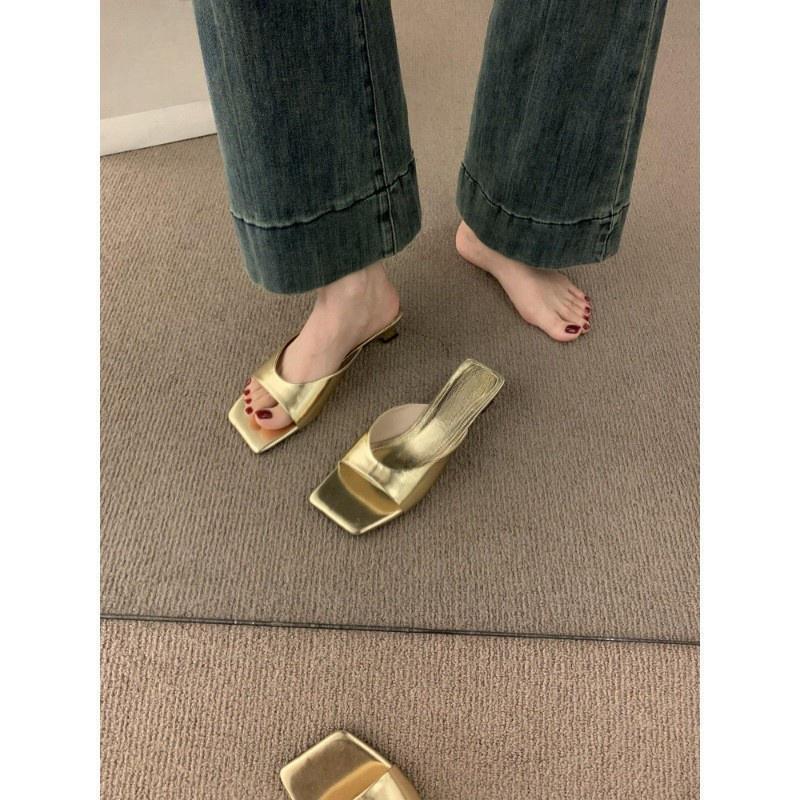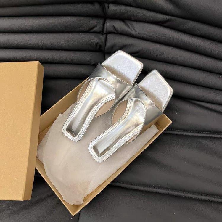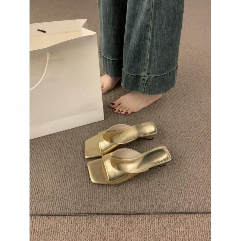 极简风露趾方头绝美拖鞋女夏外穿年新款小猫跟气质银色凉拖鞋