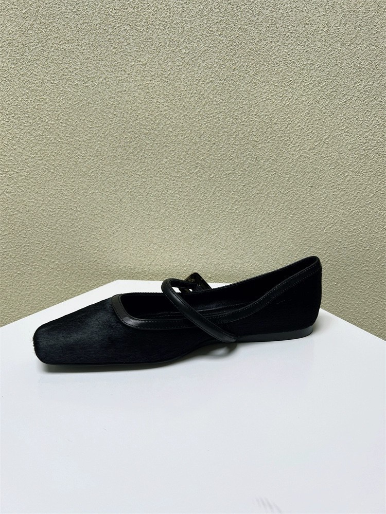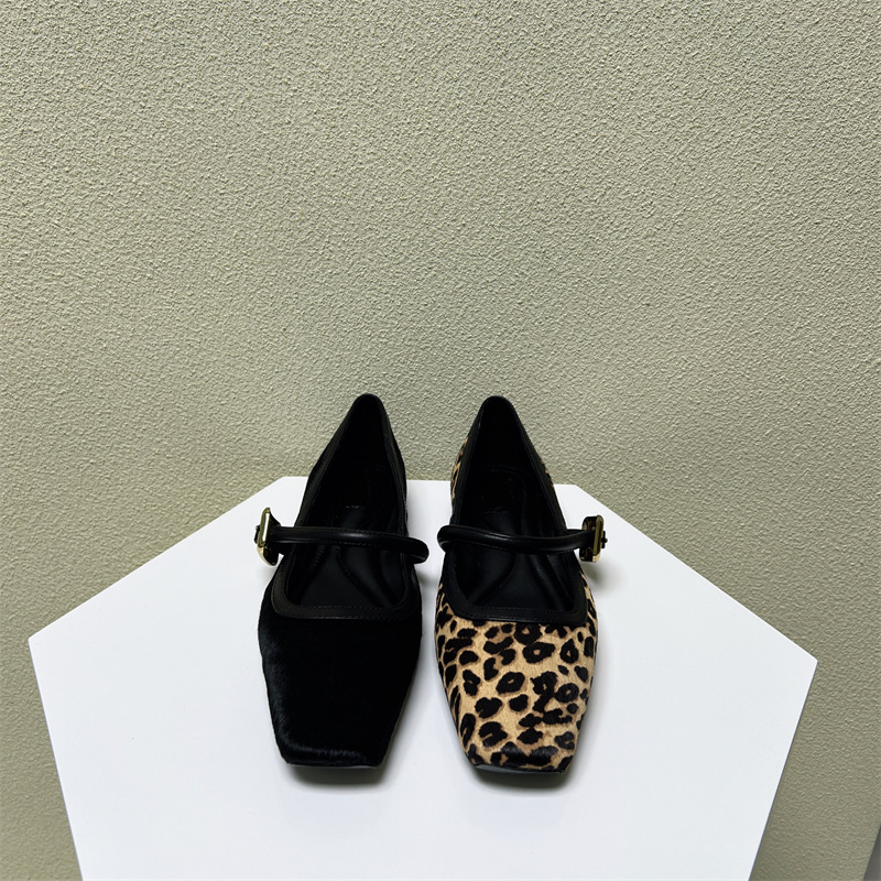 欧洲站女鞋2023秋季一字带真皮马毛豹纹方头平底鞋欧货浅口单鞋女