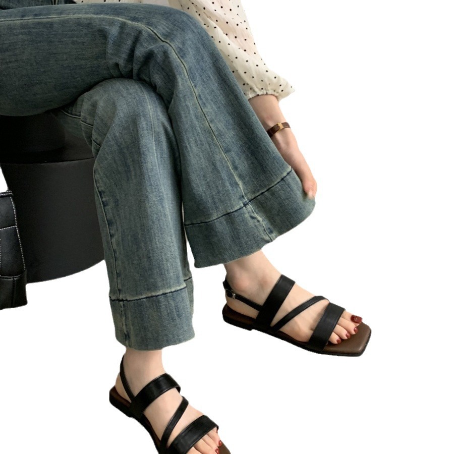 露趾凉鞋女夏季外穿新款韩版复古仙女风一字扣带软平底罗马鞋