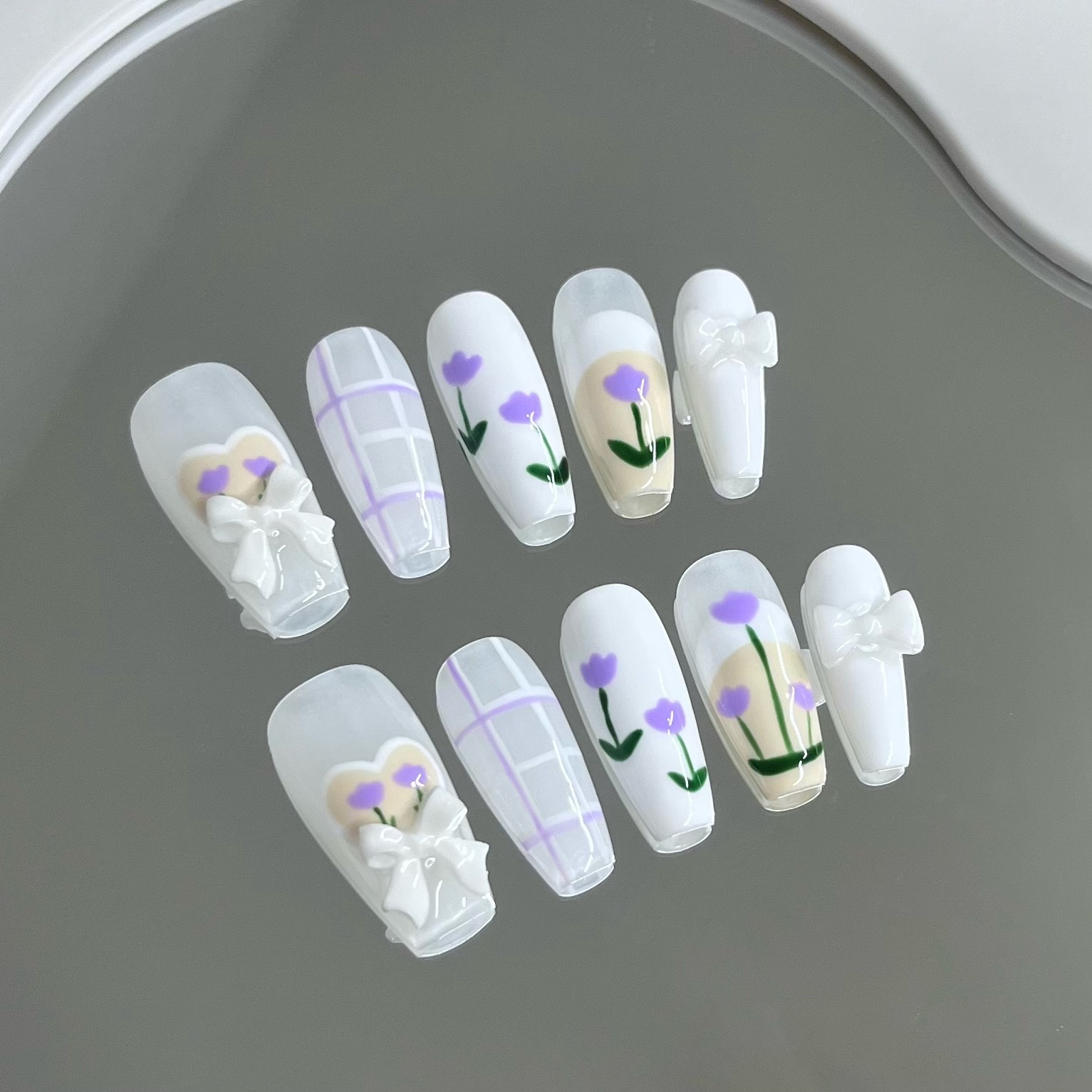 纯手工穿戴甲少女的花园甜美可爱风奶白色手绘郁金香光疗甲美甲贴