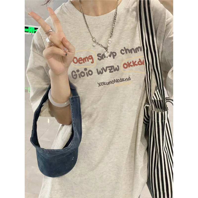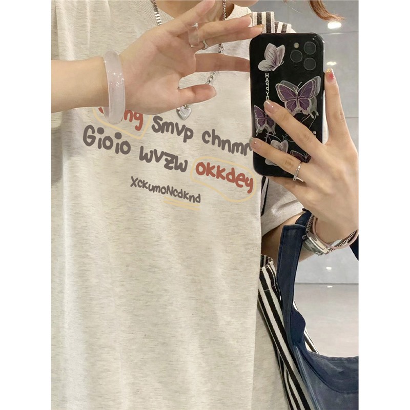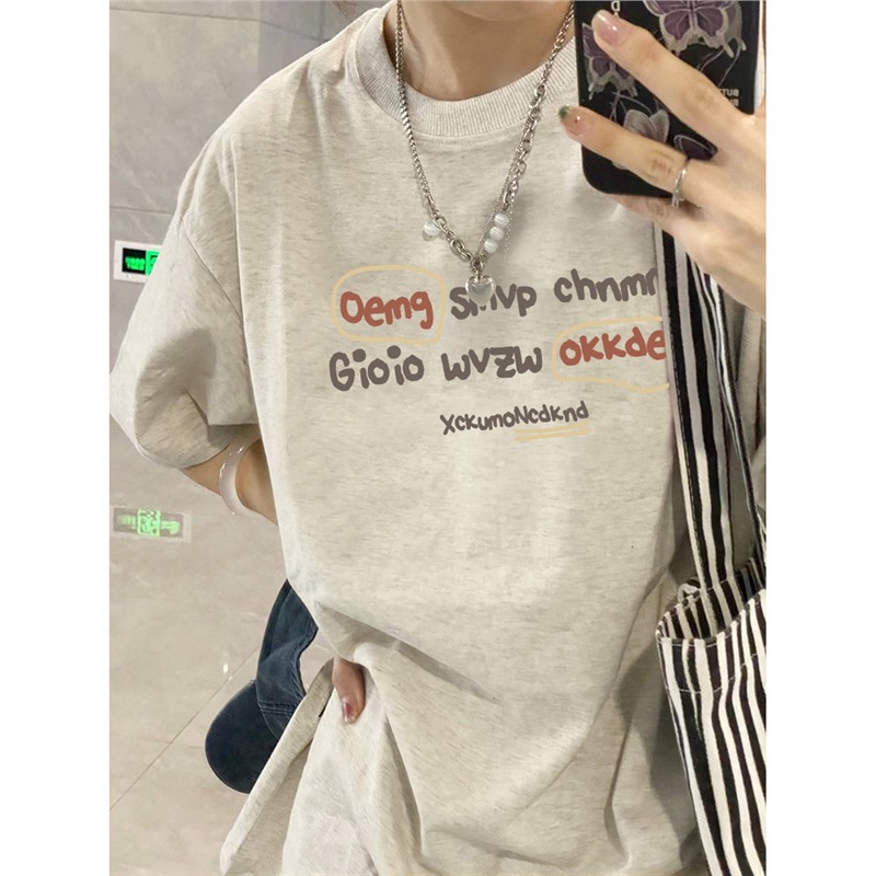 纯棉大码短袖t恤女新款夏季灰色设计感小众美式宽松半袖上衣