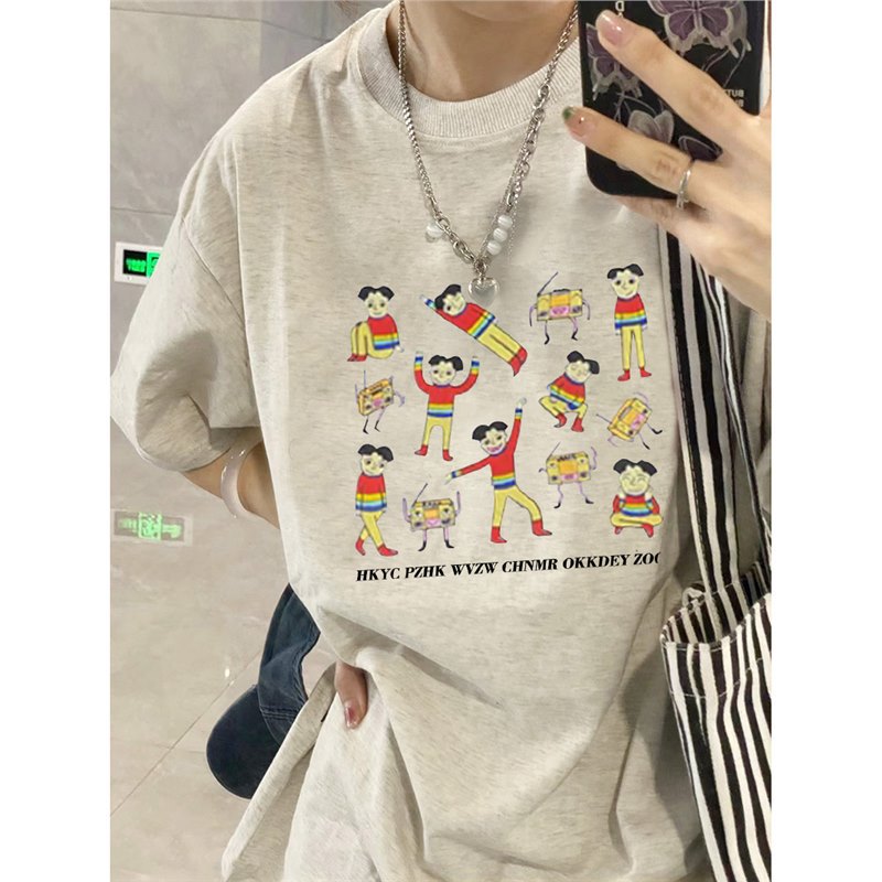 韩版复古卡通印花重磅新款纯棉短袖t恤女水洗做旧中长款上衣夏季