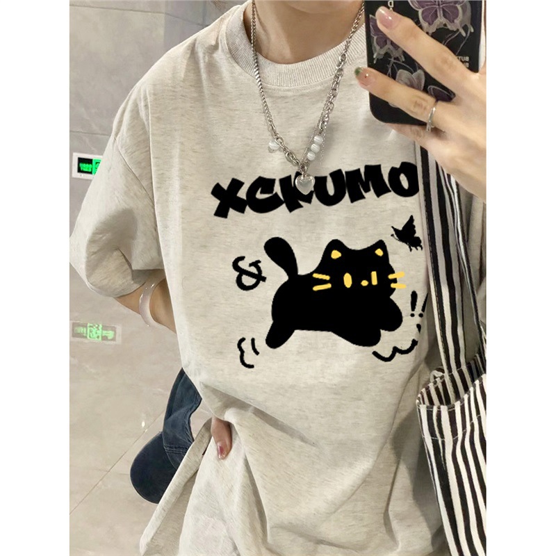 200斤纯棉灰色短袖t恤女新款夏季设计感小众美式宽松半袖上衣