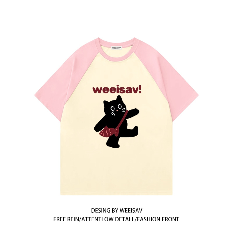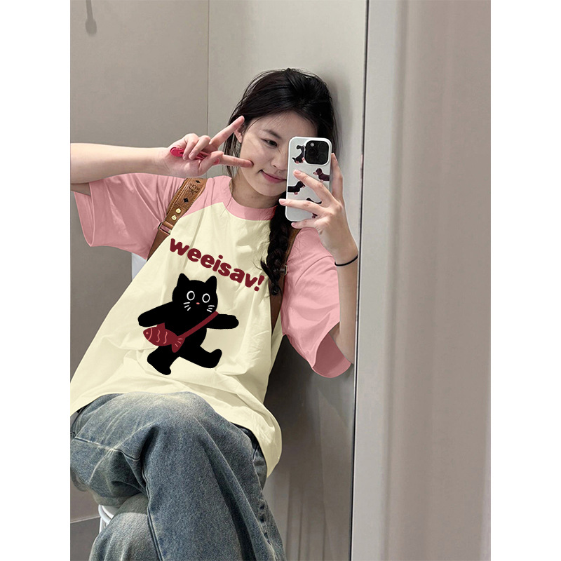 200斤纯棉美式粉色插肩大码短袖t恤女夏季宽松拼色胖mm上衣潮牌