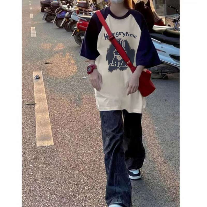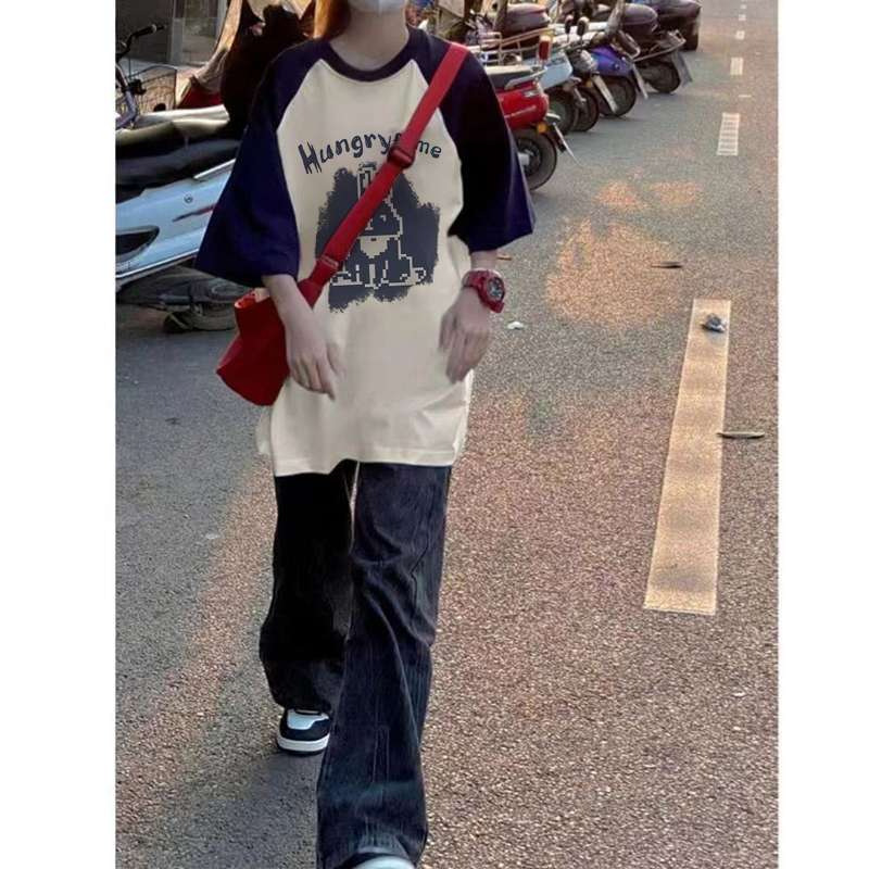 200斤纯棉设计感插肩短袖t恤女夏季大码印花胖mm宽松显瘦拼色上衣