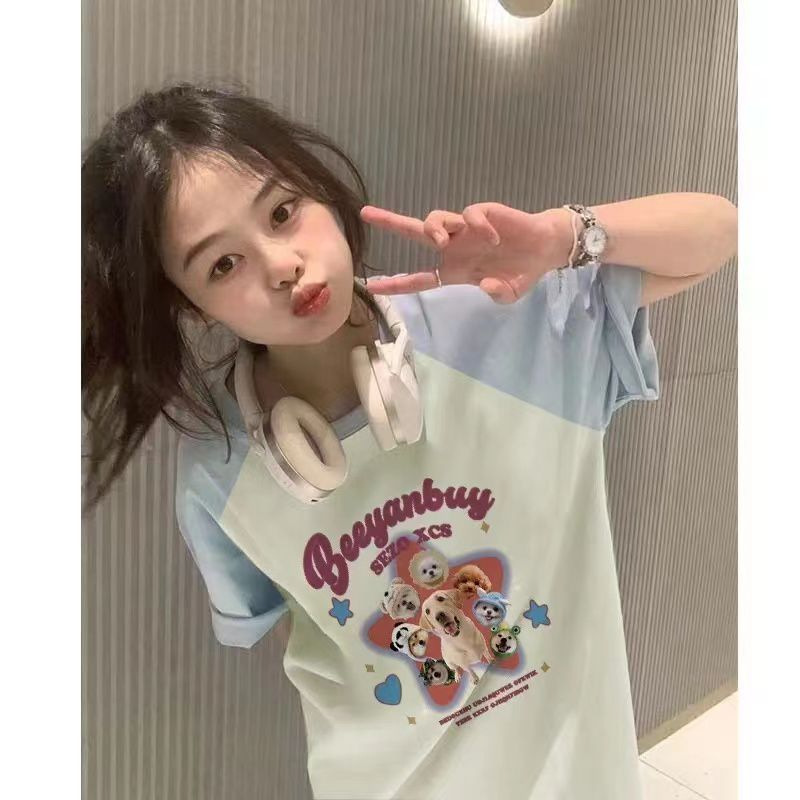 200斤纯棉美式纯棉大码插肩短袖t恤女夏季胖mm半袖拼色休闲百搭上