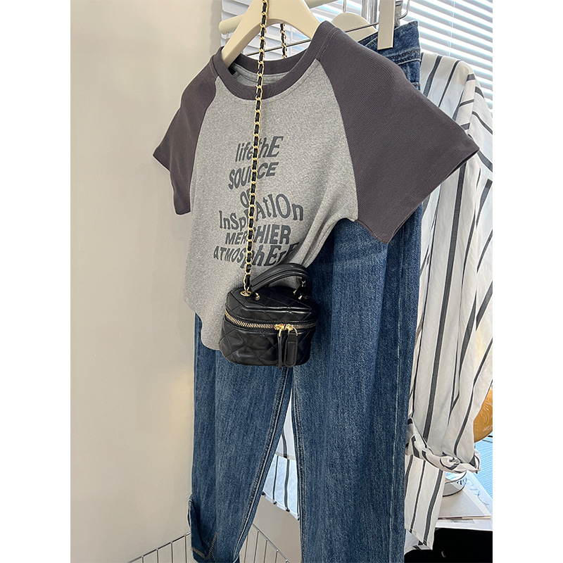 插肩t恤女短袖夏季新款字母印花设计感修身甜辣短款上衣