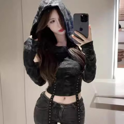 废土风手工磨破晕染连帽漏肩长袖T恤女显瘦高腰个性短款上衣