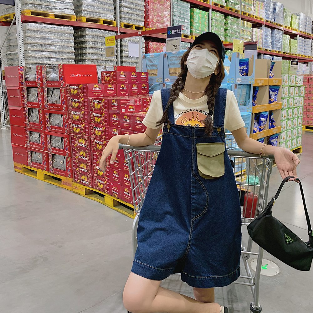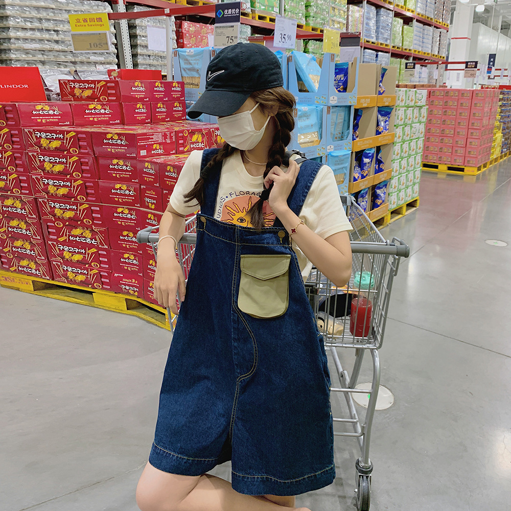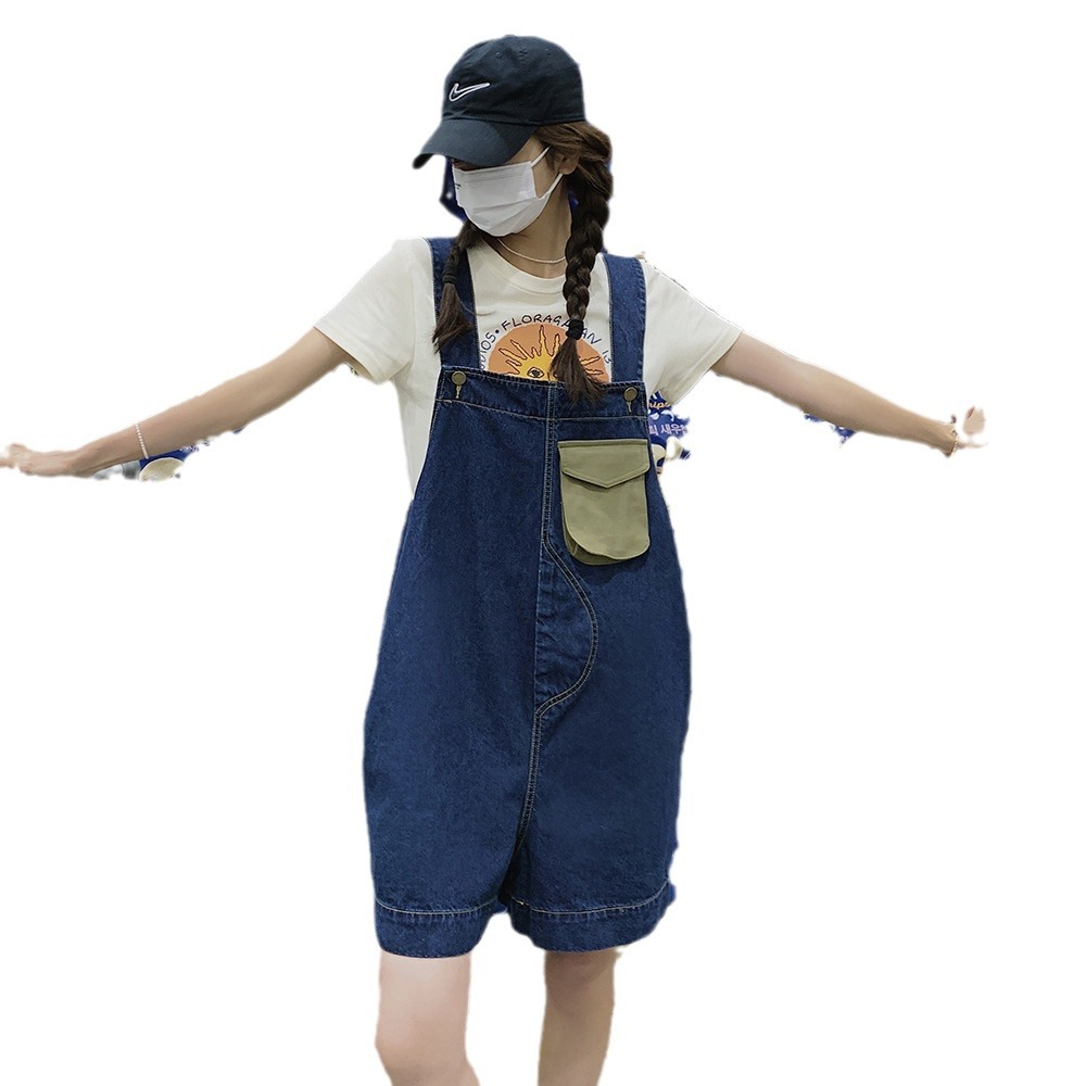 复古时尚无袖牛仔背带裤女夏季新款减龄短裤小个子吊带连体裤