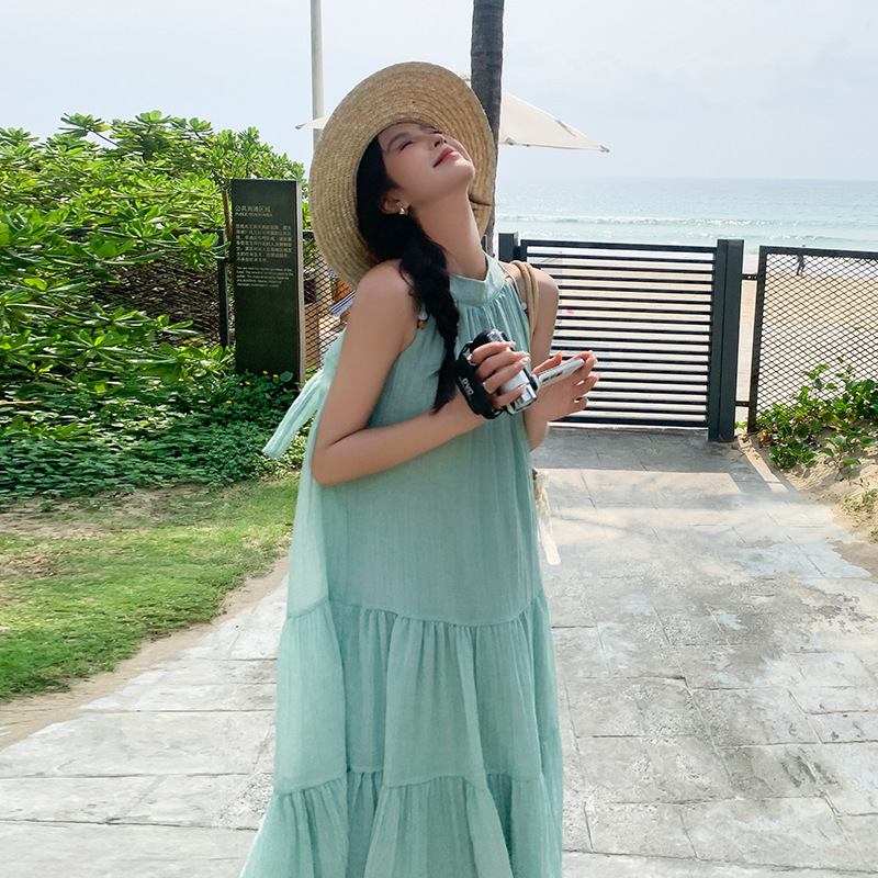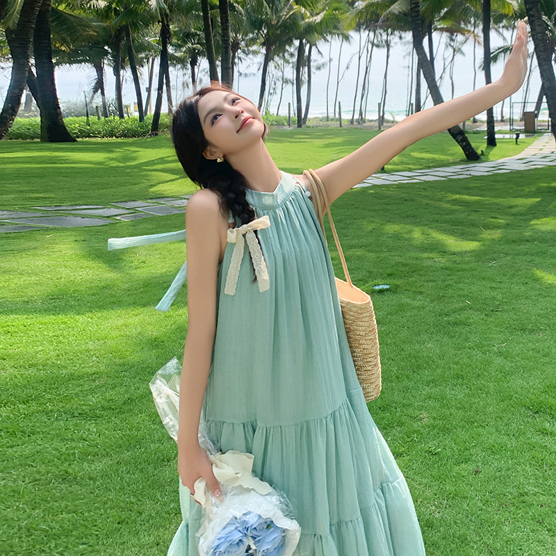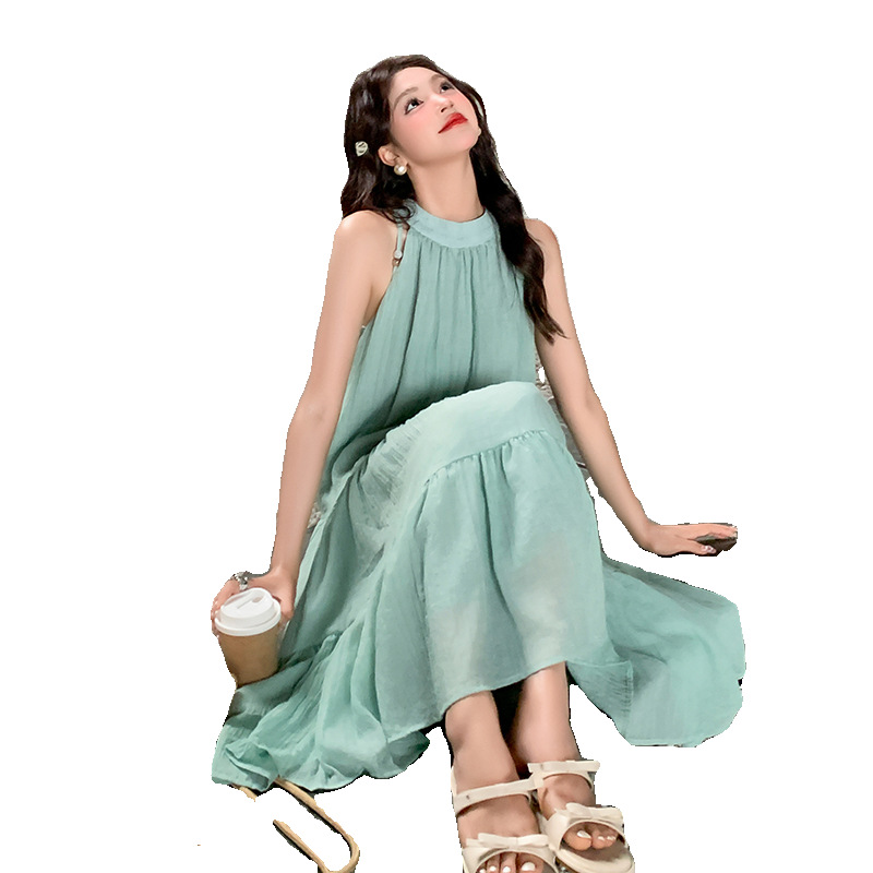 复古法式气质度假长款无袖小个子裙子夏季新款挂脖露肩连衣裙