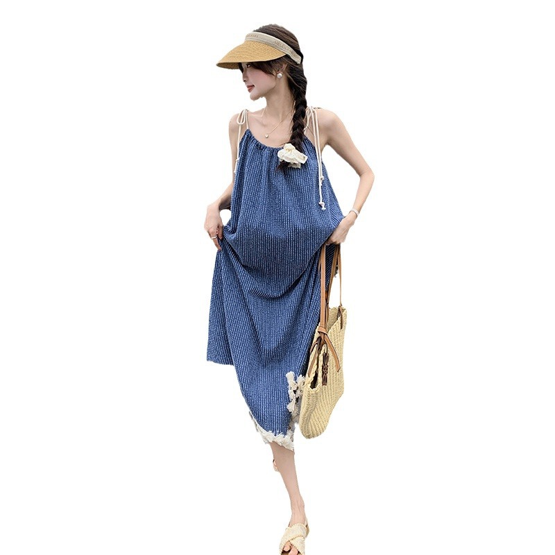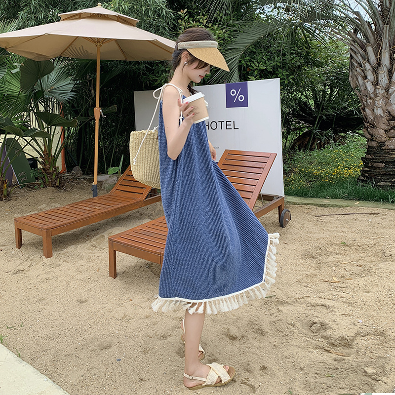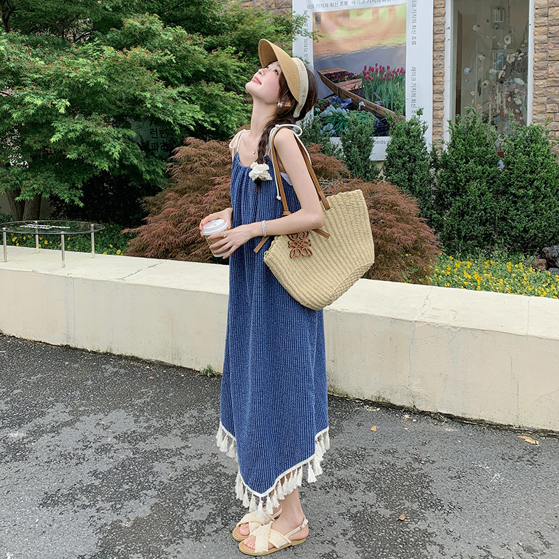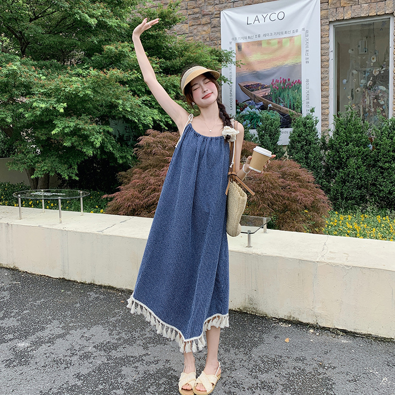 法式流苏吊带连衣裙牛仔夏季新款显瘦不规则宽松长裙气质裙子