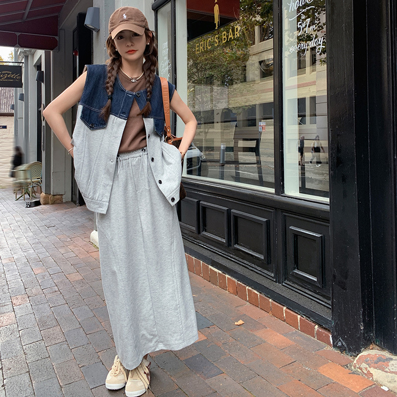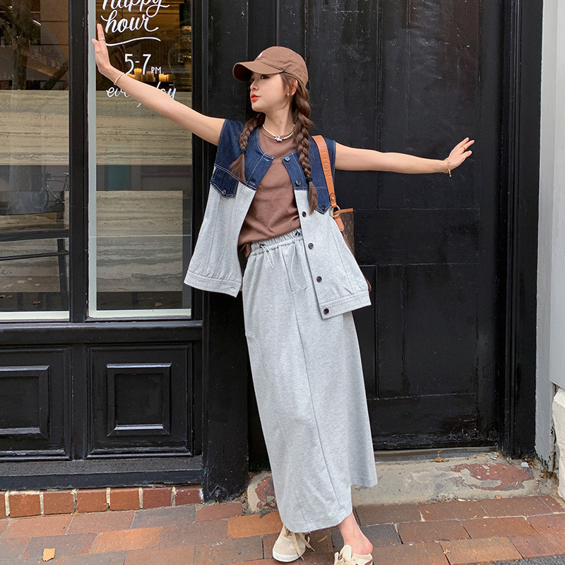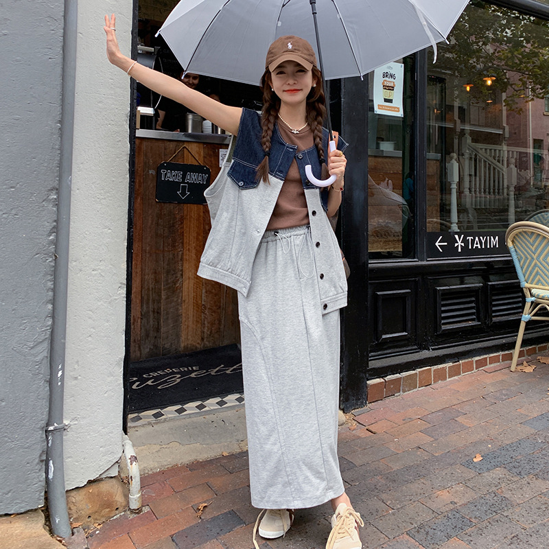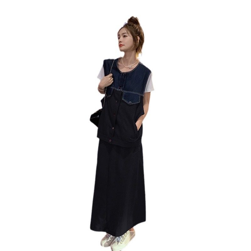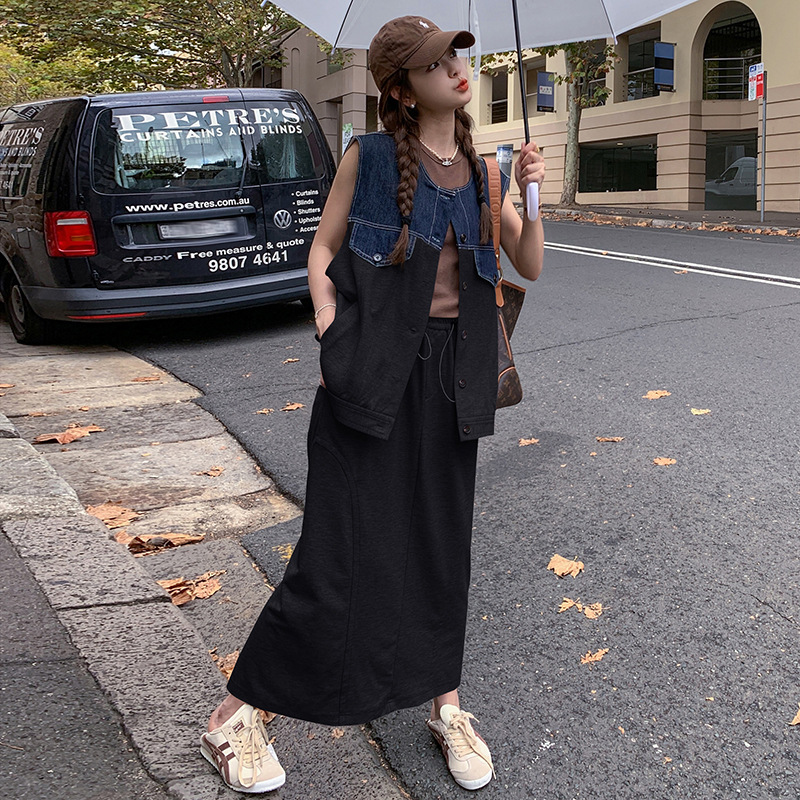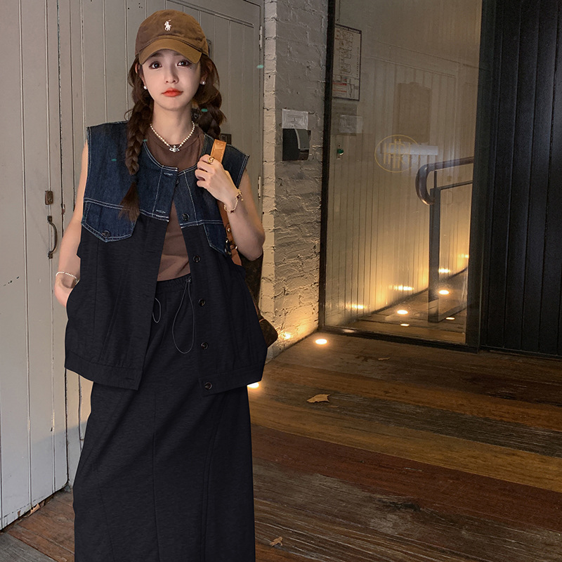 小众设计休闲时尚套装夏季新款复古牛仔拼接马甲半身裙两件套