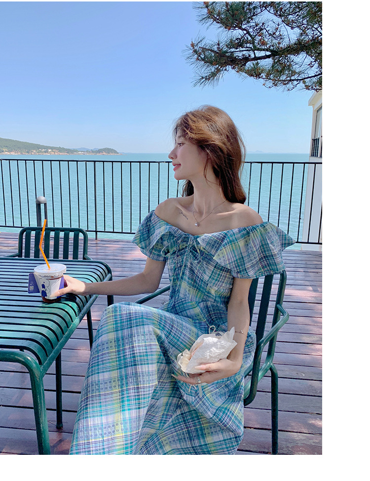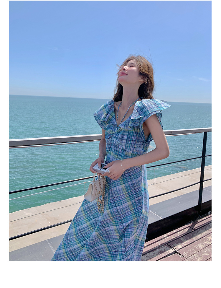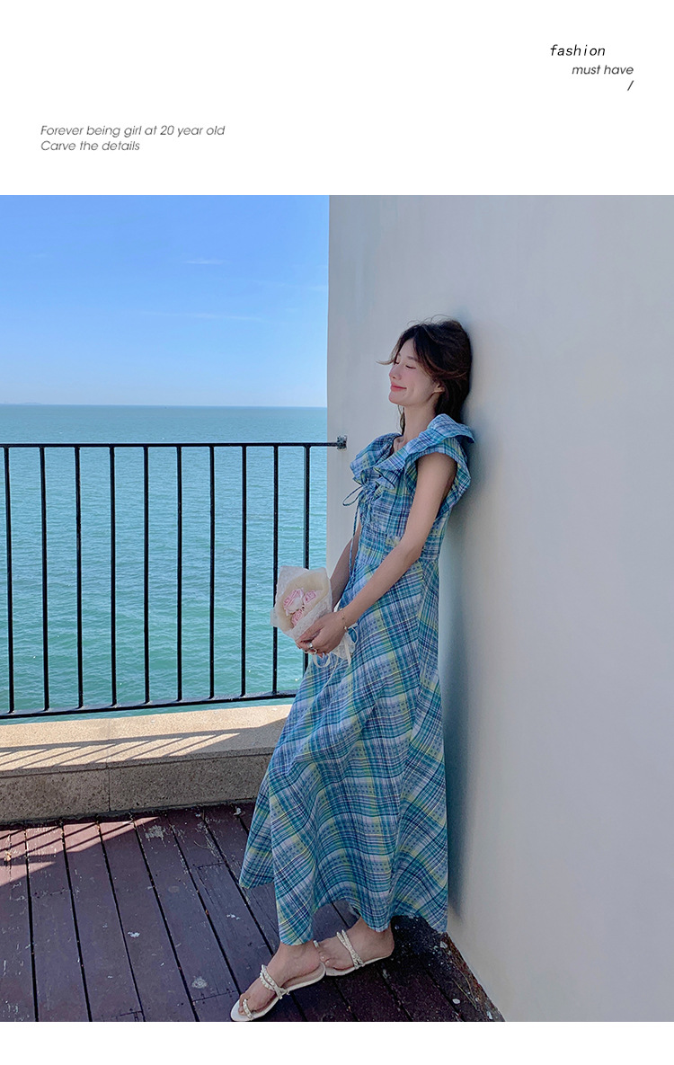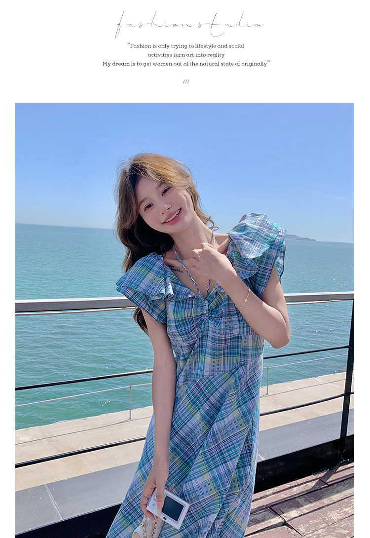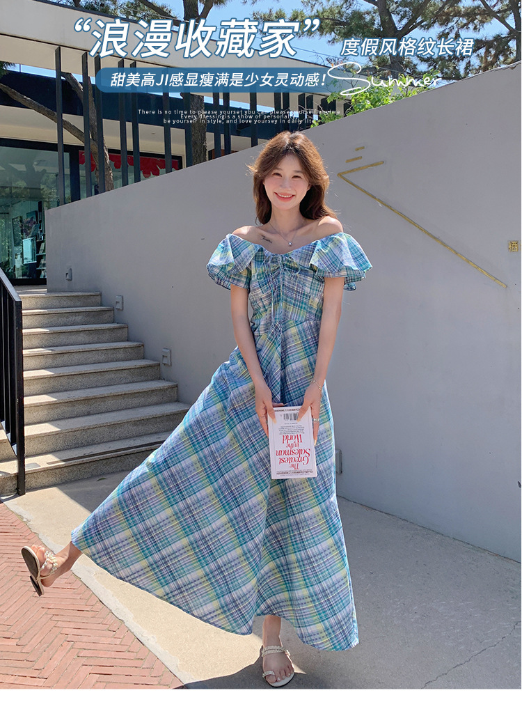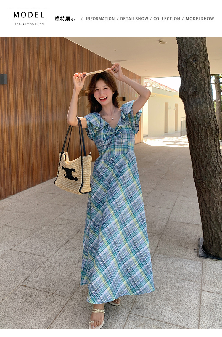 法式V领格子拼接长裙女夏季新款复古收腰设计感休闲连衣裙子