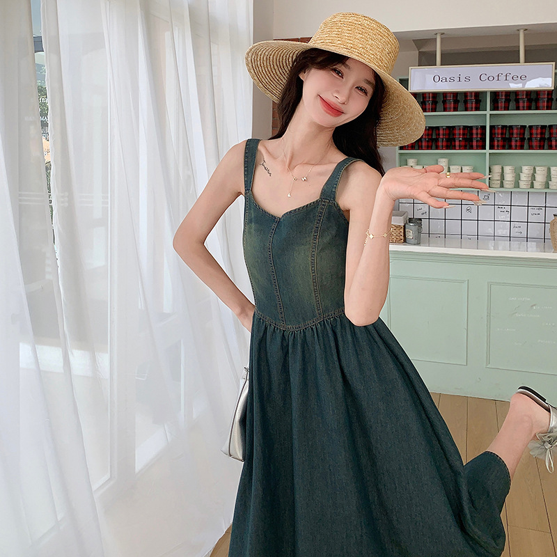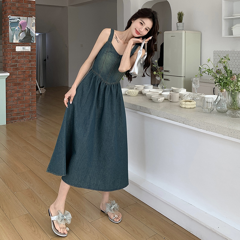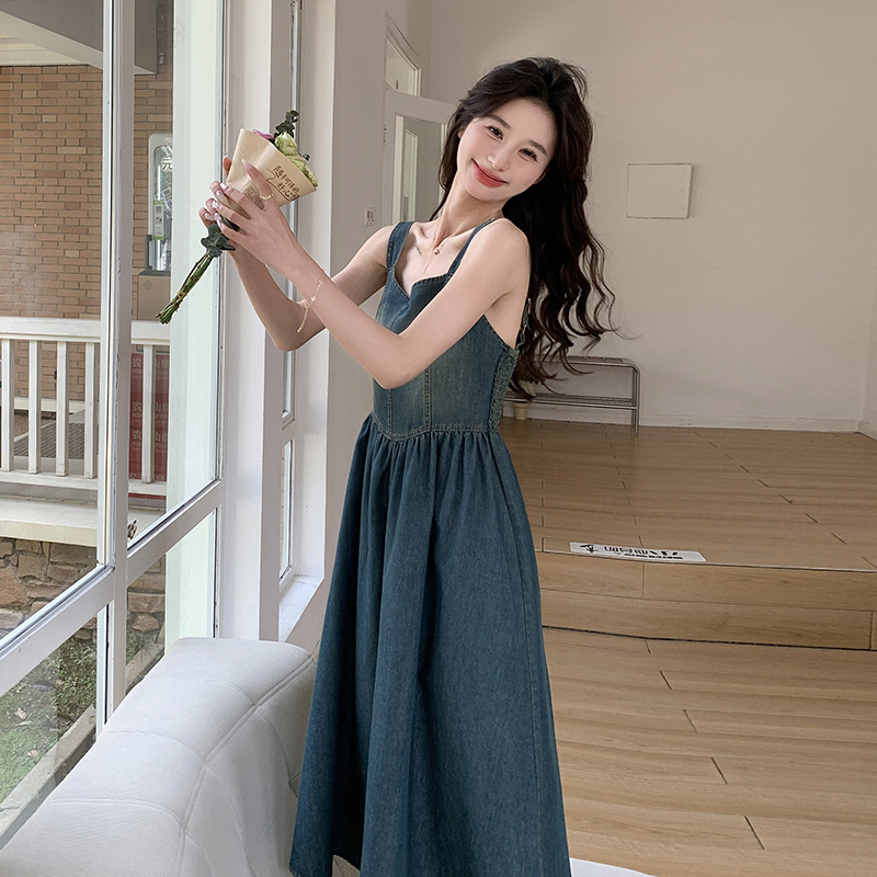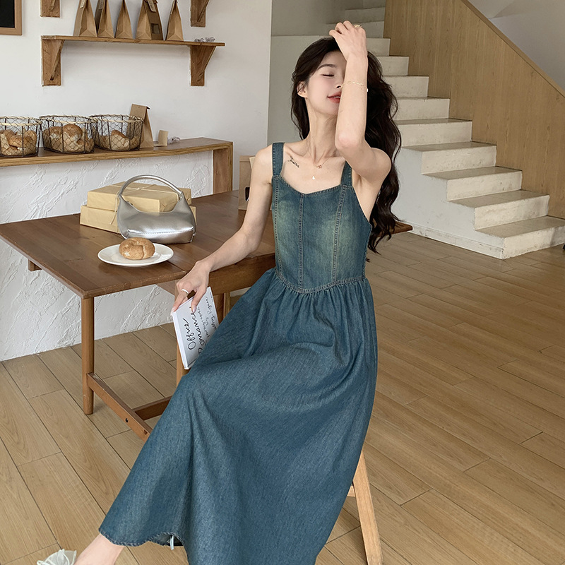 韩系网红炸街复古牛仔吊带裙夏季高级气质休闲收腰长款连衣裙
