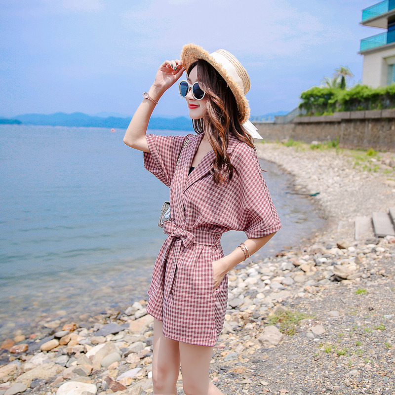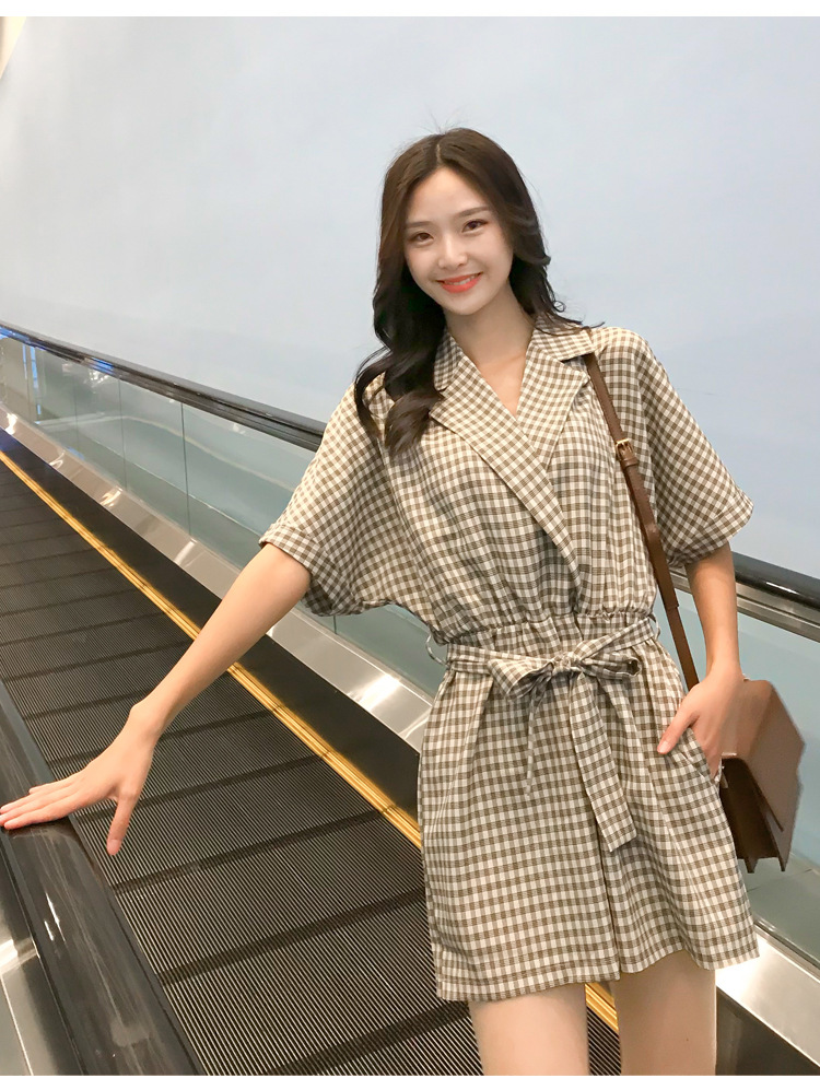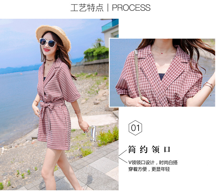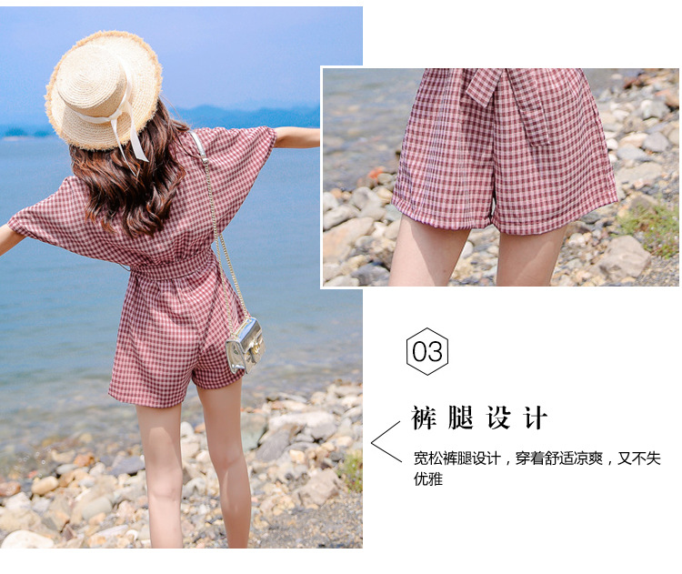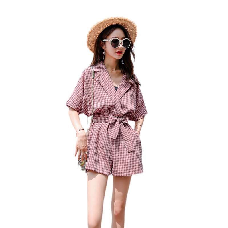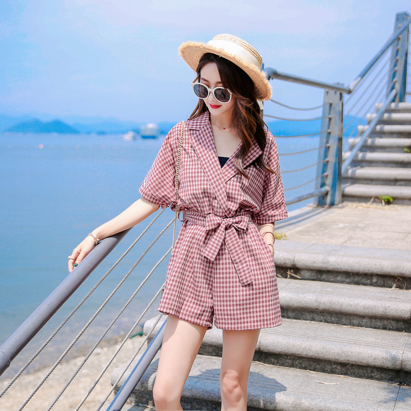 港风时尚格子修身腰带款短裤女夏季新款小个子时尚休闲连体裤