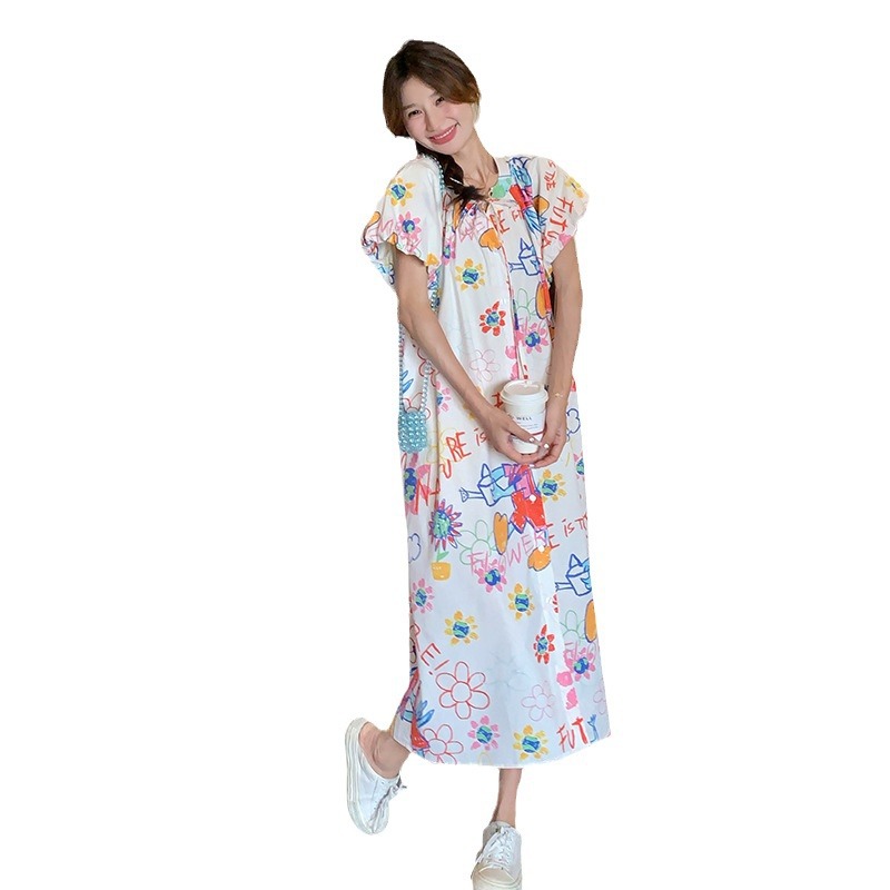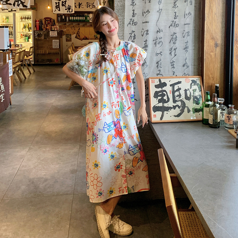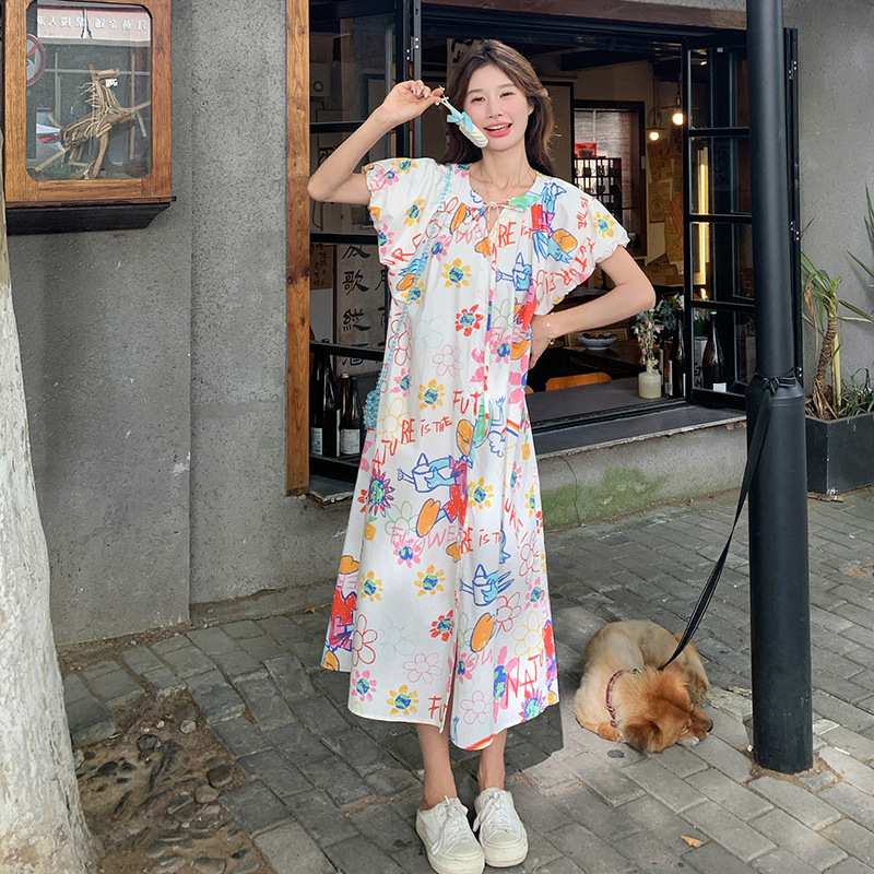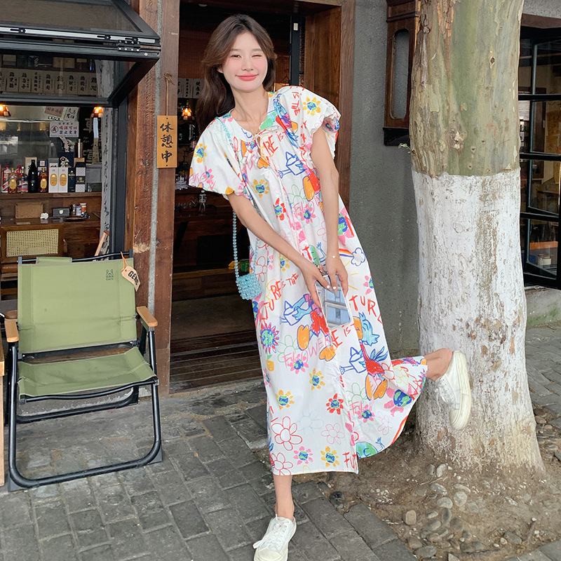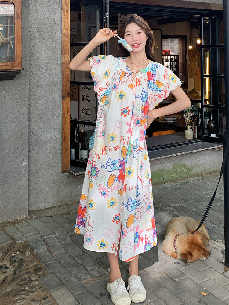 碎花减龄涂鸦甜美印花花边连衣裙夏季新款多巴胺拼接宽松裙子