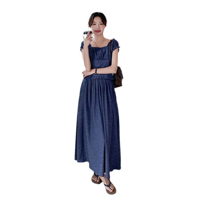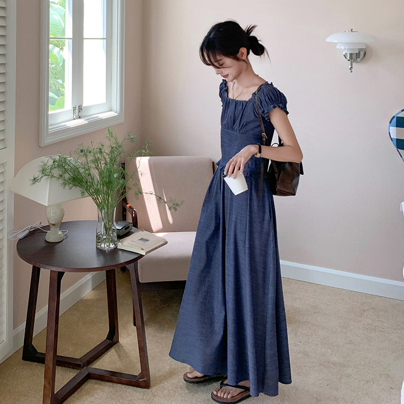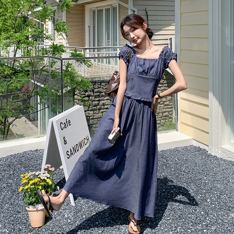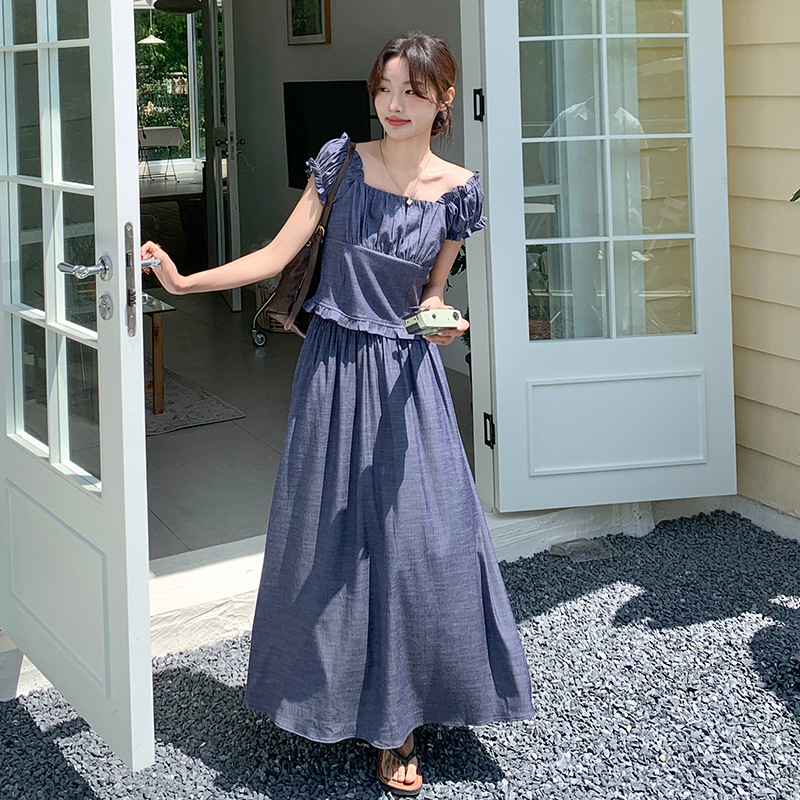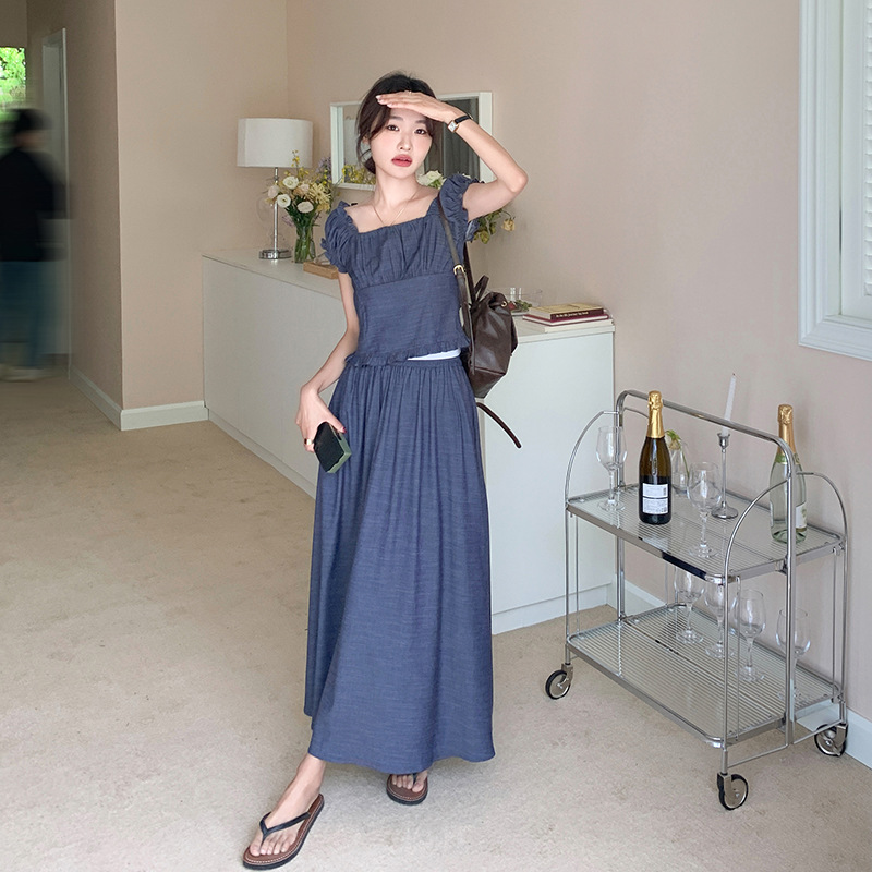 气质泡泡天丝牛仔上衣套装夏季新款系带显瘦高腰半身裙两件套