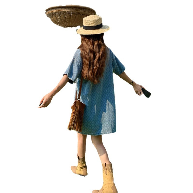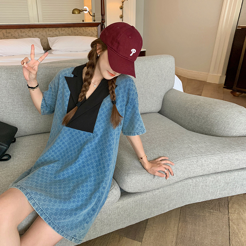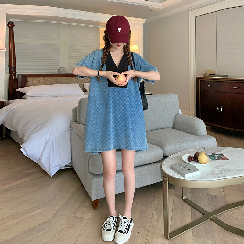 宽松西装牛仔格子连衣裙新款夏季棋盘拼接设计小个子遮肉裙子