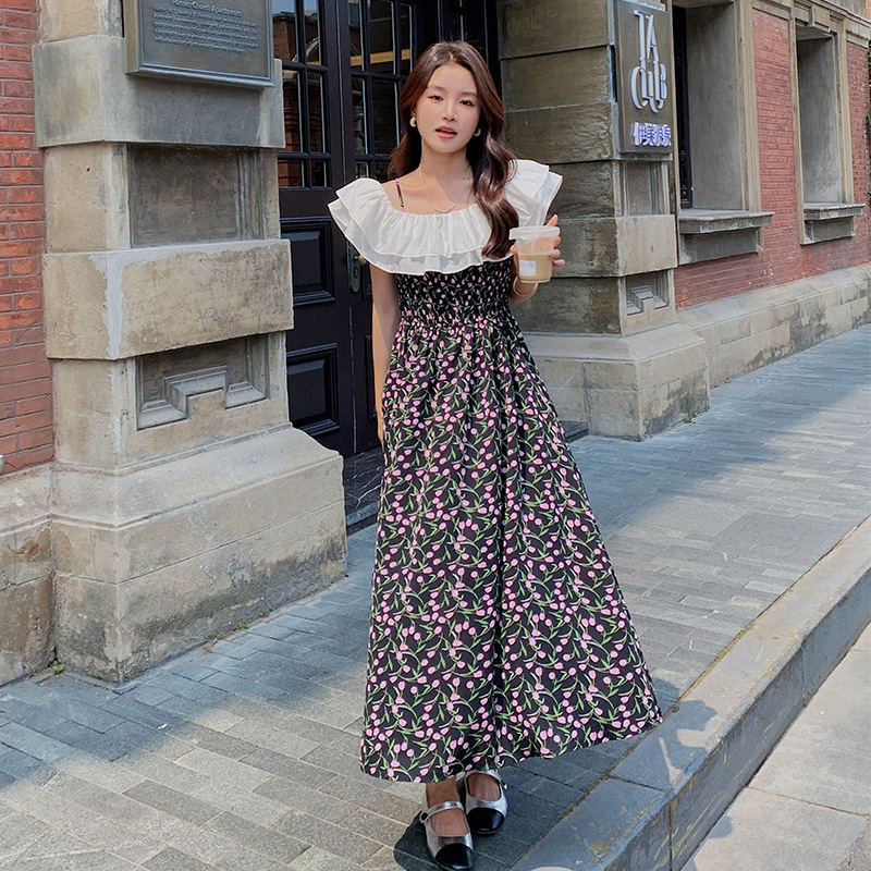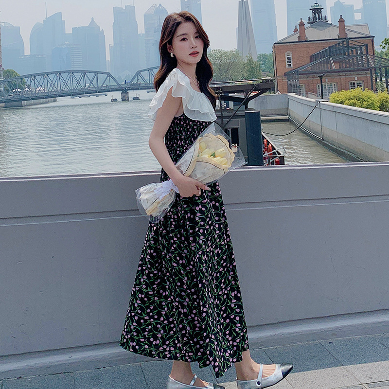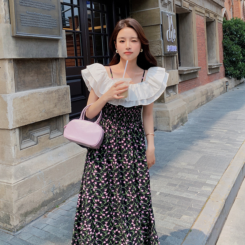 法式一字碎花吊带过膝连衣裙女夏夏季新款设计收腰显瘦吊带裙
