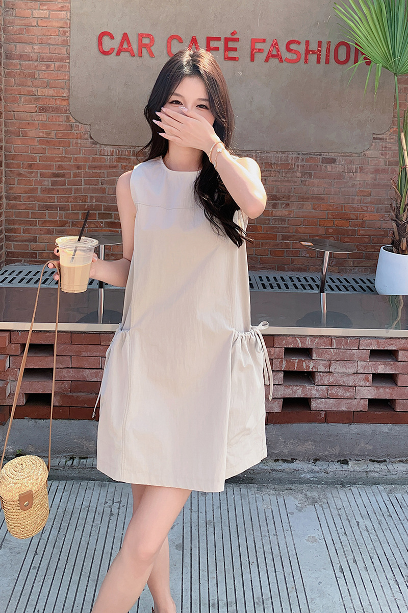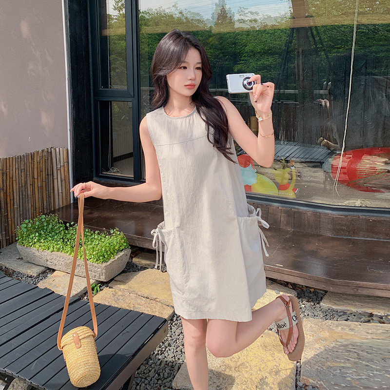 韩版时尚休闲连衣裙夏季新款设计感宽松圆领无袖大口袋短裙子