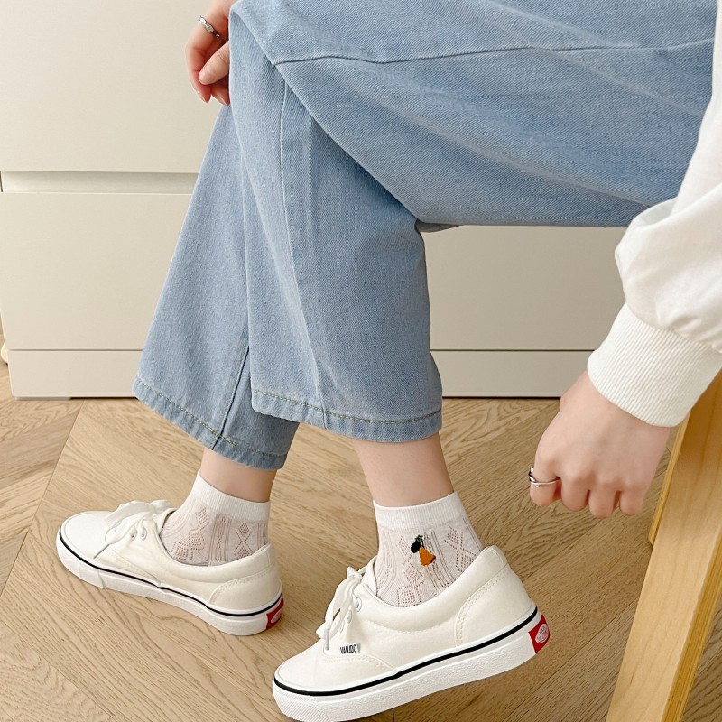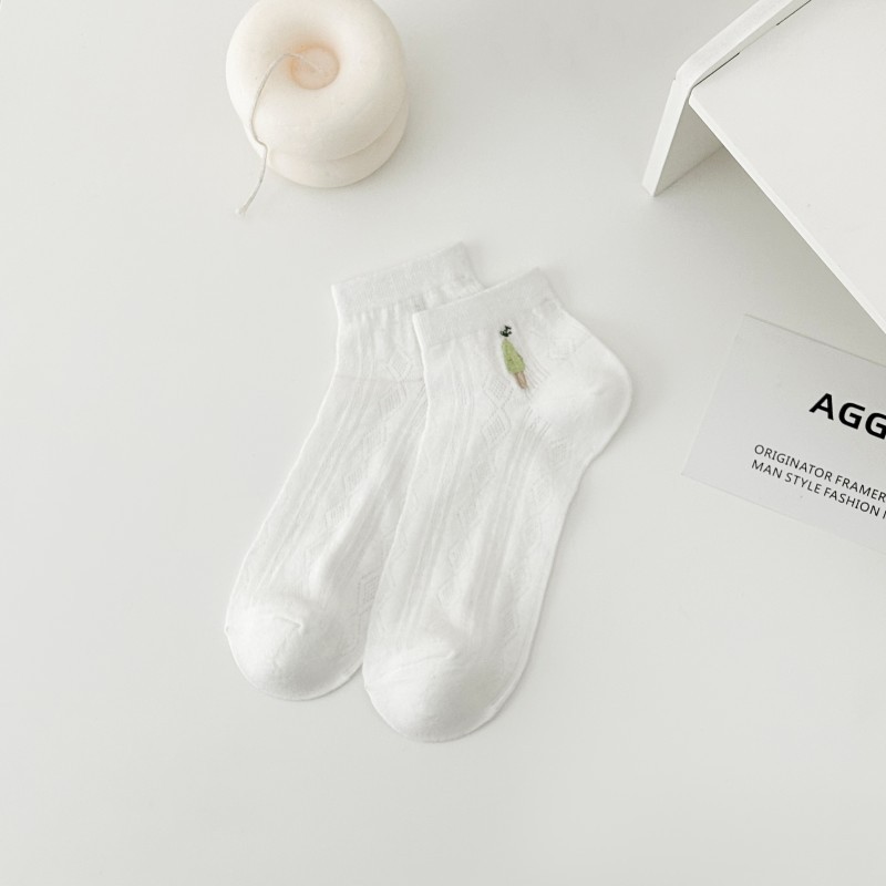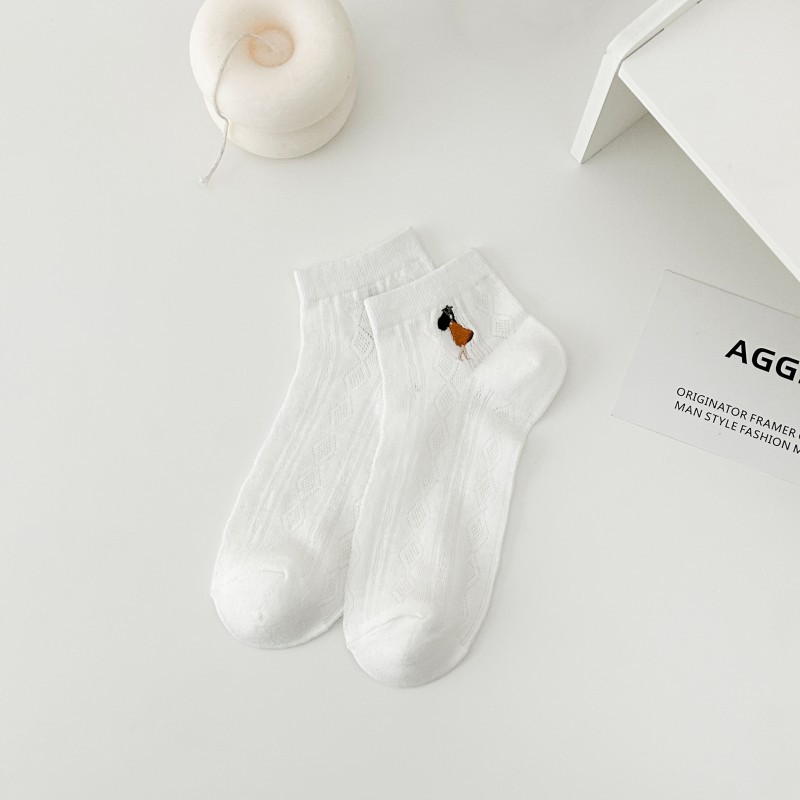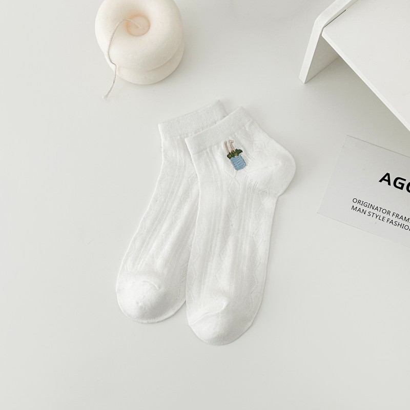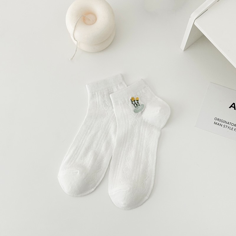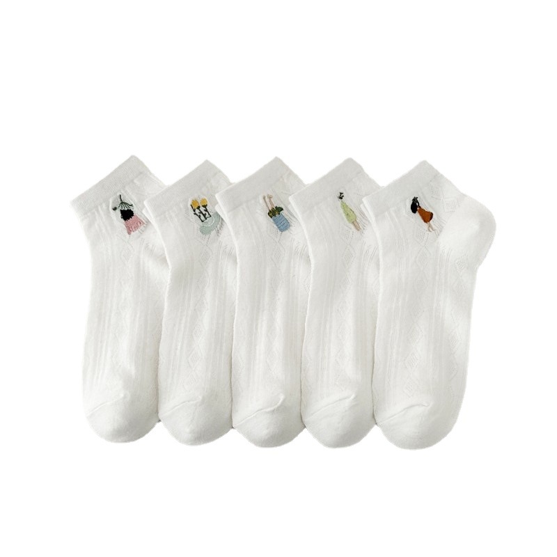 白色短袜女春夏船袜网面袜ins少女刺绣学生袜日系纯色休闲袜子女
