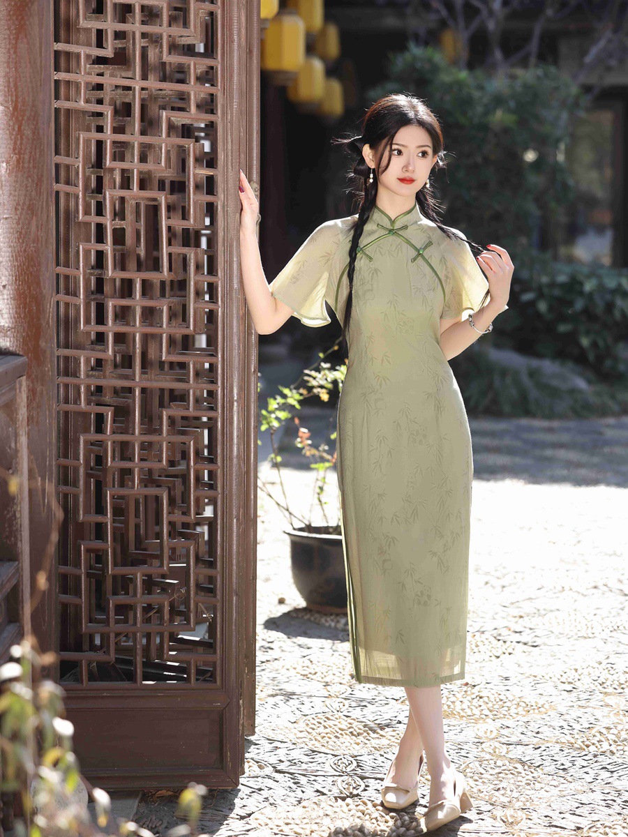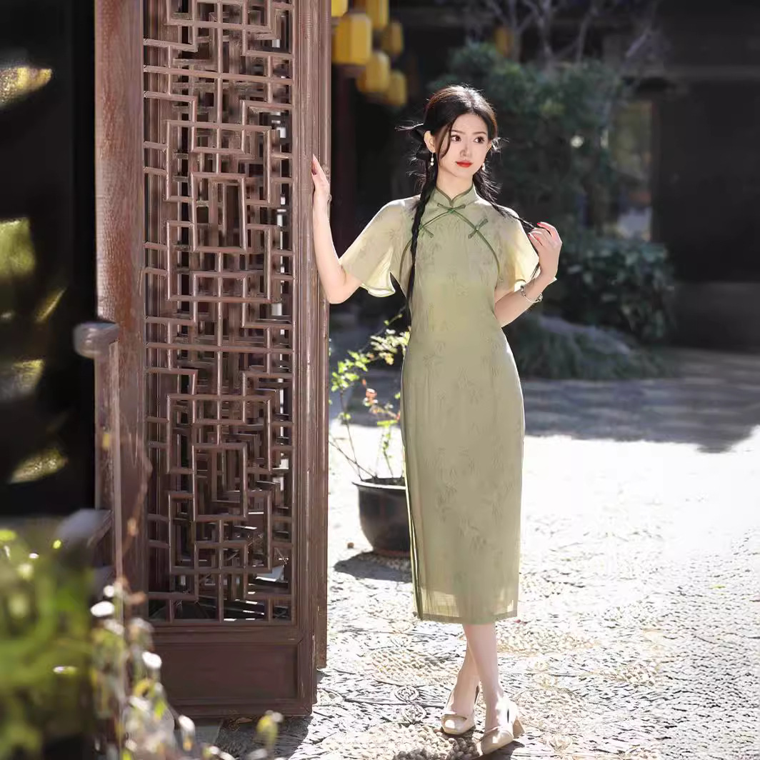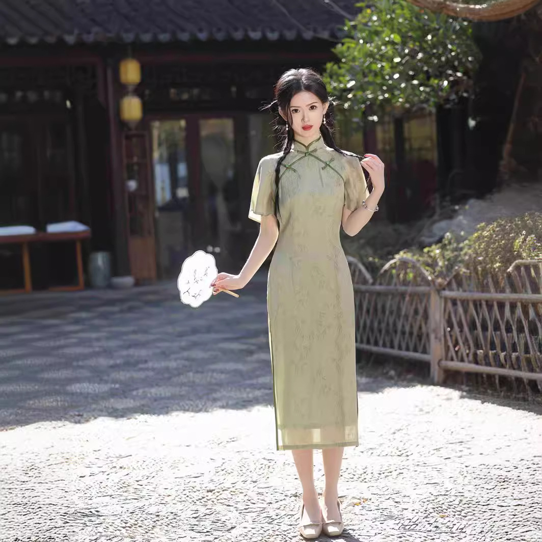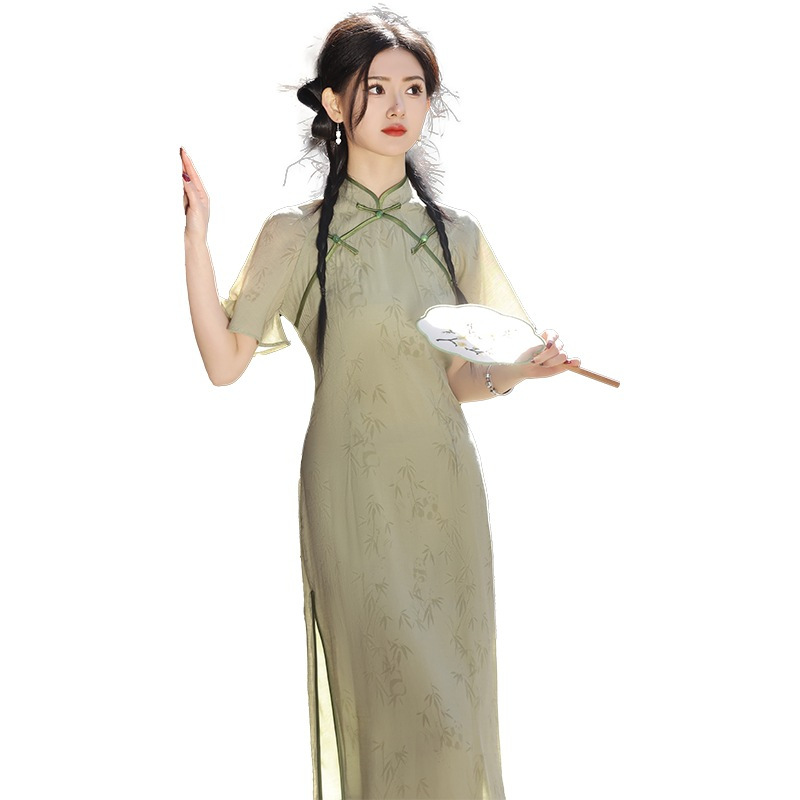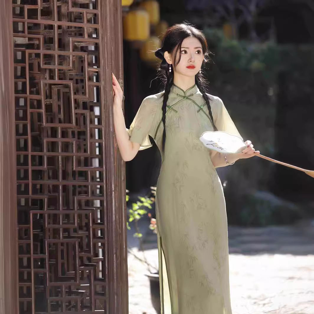 绿色丝麻倒大袖旗袍春夏复古民国风年轻款少女小个子连衣裙